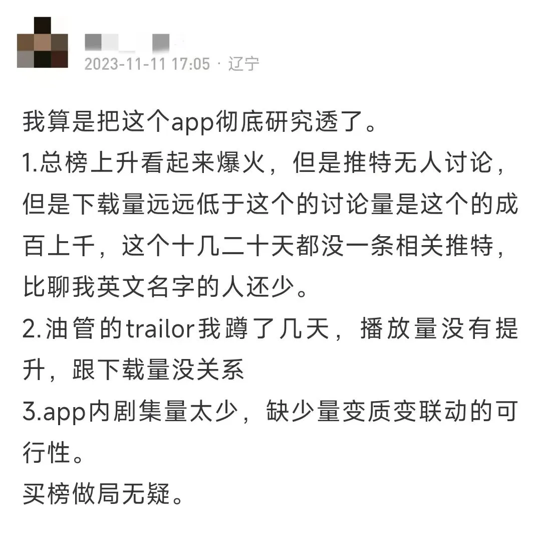 近日,有投资者反映称,ReelShort总榜上升看起来火爆,但在X平台无人讨论、YouTube预告片播放量也没有提升,由此质疑ReelShort“买榜做局”。