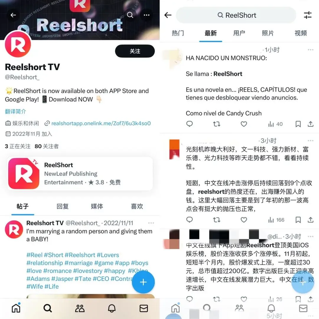 对此,记者昨日间接求证获悉,ReelShort的X平台账号仅有80个关注者,一共发了13个帖子,帖子下几乎没有评论、转发、点赞。在X平台上搜索ReelShort相关内容,过去24小时仅有十几篇推文,其中相当一部分还是用中文讨论“中文在线”“短剧出海”,且没有评论、转发、点赞。