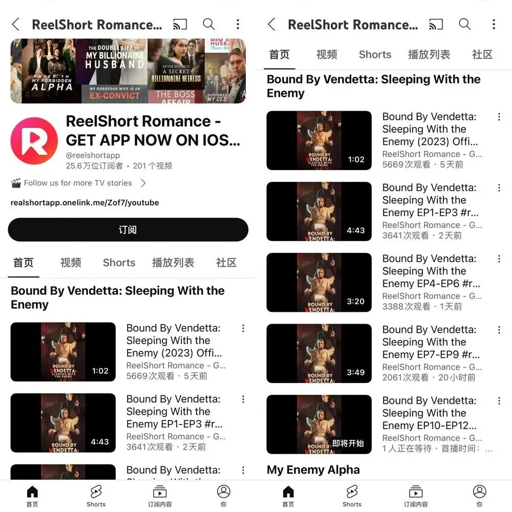 ReelShort的YouTube账号目前有25.6万位订阅者,发布了201个视频。低的有2005次观看,高的有50万次观看,最高达444万次观看。记者注意到,播放量较高的几个视频都是ReelShort上的短剧合集。在YouTube上搜索ReelShort相关内容,除了官方发布的视频,几乎没有其他用户发帖。