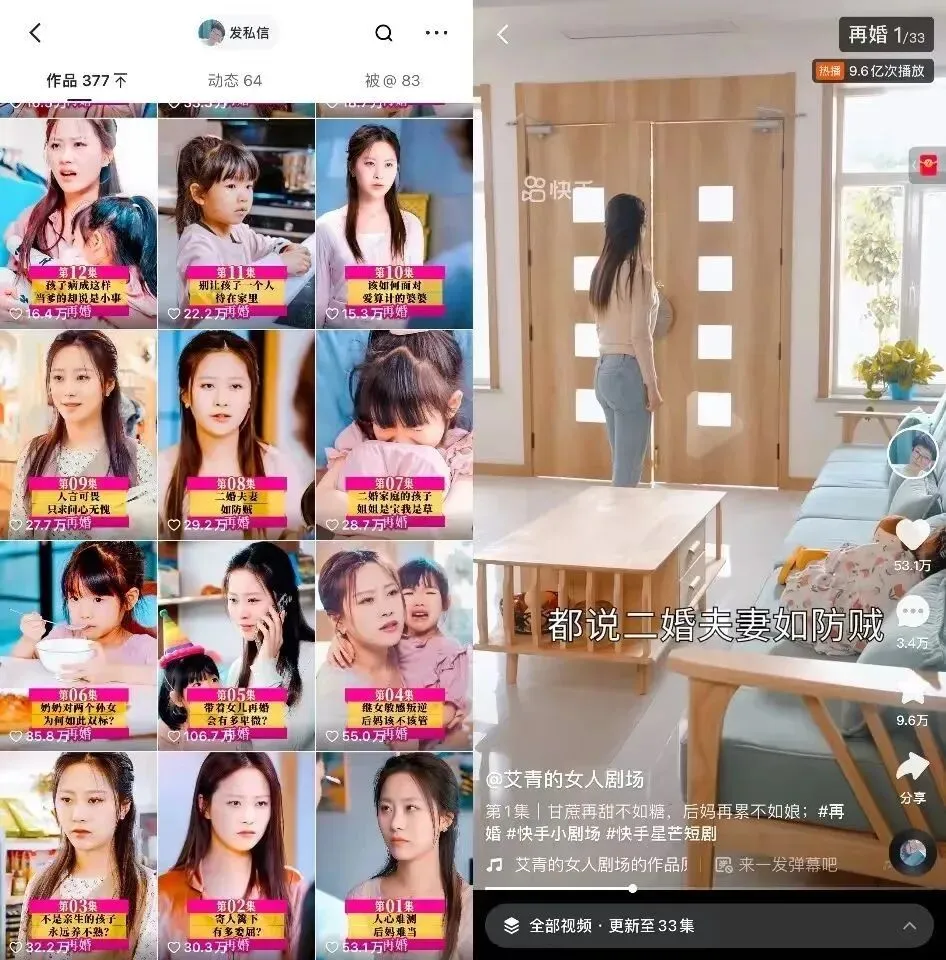 汤明明是一个工科生,半路出家做了短剧,她的冬漫社作品和所谓传统的短剧观众年龄低的判断背道而驰,她专注在30+女性观众的服务上。在快手短剧开始题材百花齐放后,汤明明盯住了家庭题材,接连推出了《女人的复仇》《单亲妈妈奋斗记》等爆款短剧,今年夏天在快手热播的《再婚》达到近10亿播放量。这样的题材能爆,对于早期短剧来说是不可想象的。汤明明遵循的是找到观众定位的原则。