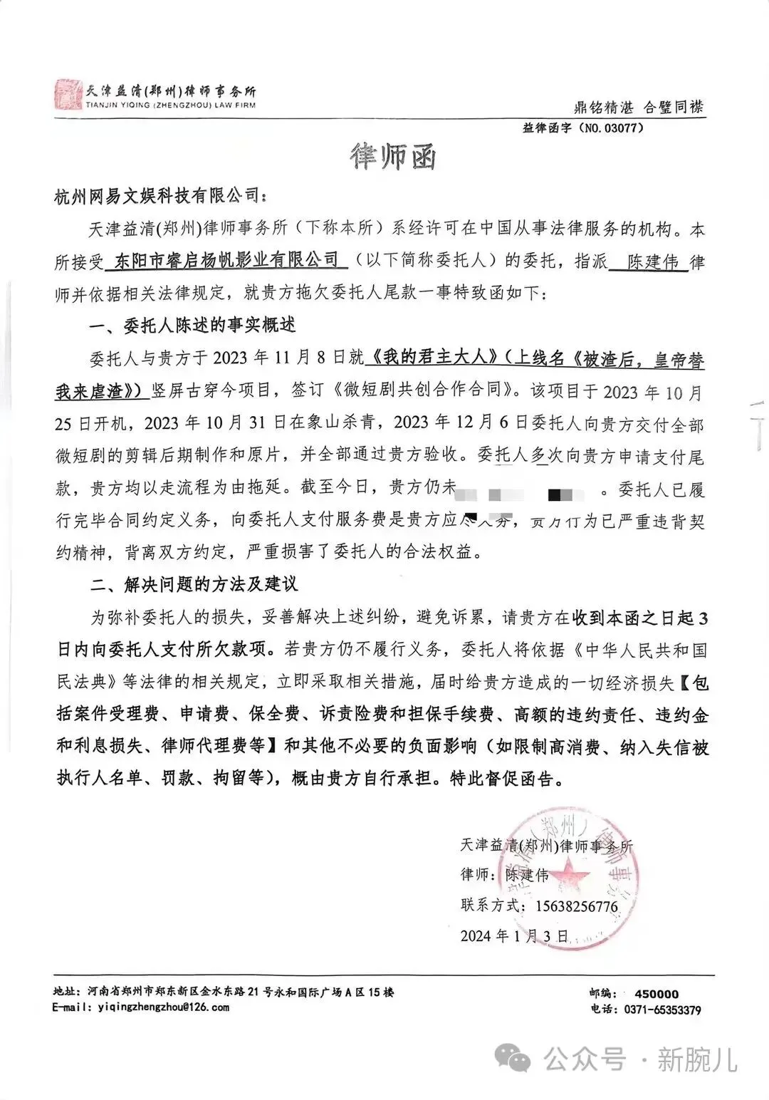 「2023年10月27日我方寄出合同,2023年11月8日对方才返回合同,返回后我方开始索要合同内符合交片前,打款条件的款项3笔。从杀青后起算拖欠了三笔款项至少10天以上。」王东阳表示。