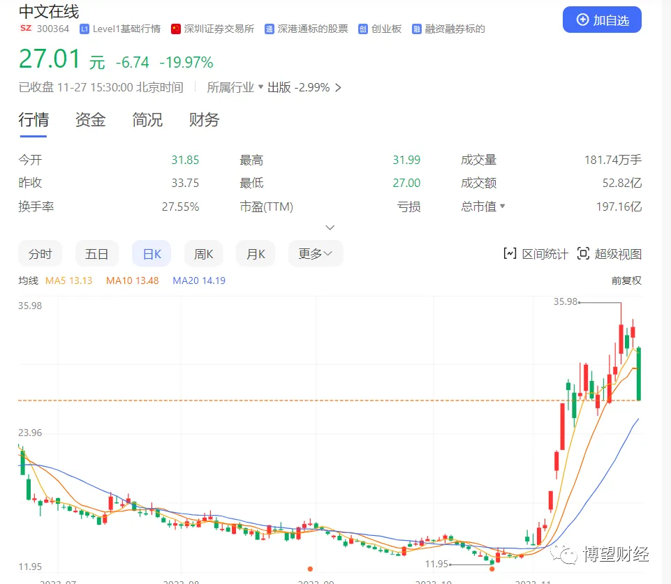 蹭概念它是专业的,而跟随热点股价自然也不差。仅从10月27日低点12.63元/股算,最高涨到过35.98元/股,截止11月27日收盘,暴跌收盘于27.01元/股。