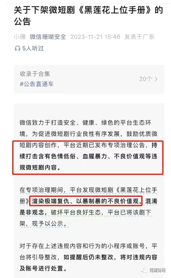 目前,短剧行业鱼龙混杂,短剧发展的核心还是内容,而诸多从业者只是为了赚快钱的流量思维,缺乏内容打磨,这也势必会加速短剧热潮的提前结束。《黑莲花上位手册》的封杀也能得到合规性的印证。11月16日,抖音平台发布微短剧治理公告,此次累计下架小程序内违规短剧119部,处置违规账号推广抖音号1188个。