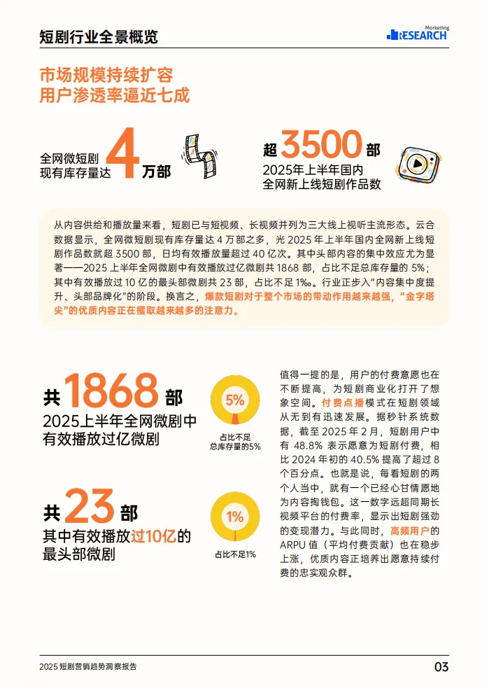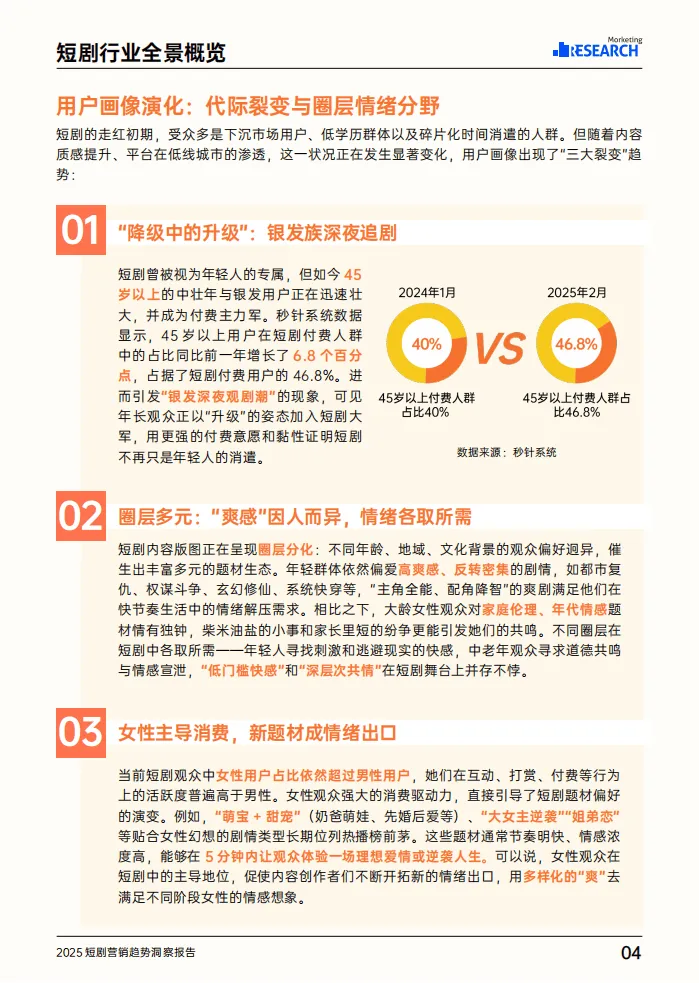行业全景呈现多重变化:市场规模持续扩容,2025年上半年新上线短剧超3500部,日均有效播放量超40亿次,头部内容集中效应显著;用户画像发生代际裂变,45岁以上银发群体成为付费主力军,女性用户主导消费,题材偏好呈现圈层分化;各大平台纷纷加码布局,从内容争夺升级为生态平台战;政策监管趋于严格,分类分级审核制度推动行业规范化发展。
