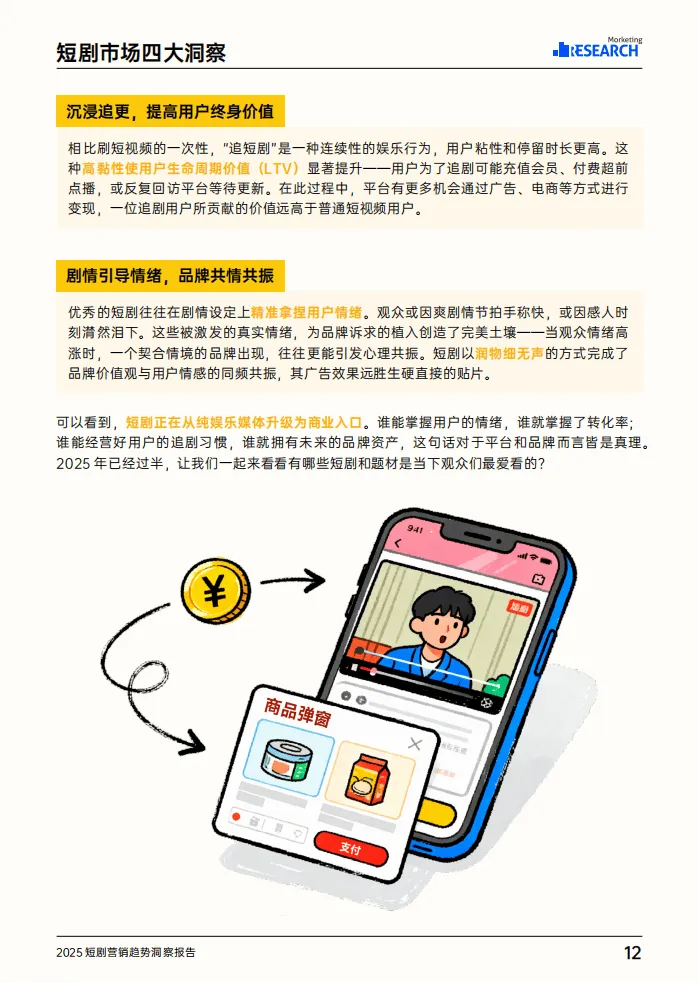 热门题材呈现多元态势,甜宠+萌宝、家庭伦理、玄幻修仙/穿越系统、现实题材、悬疑复仇/暗黑智斗五大类题材深受观众喜爱,分别契合不同圈层用户的情绪需求。品牌营销玩法不断升级,从基础的道具、场景、台词植入,到量身定制专属短剧,再到深度参与内容源头创作,最终实现全域延伸的矩阵化营销,形成完整的价值转化闭环。