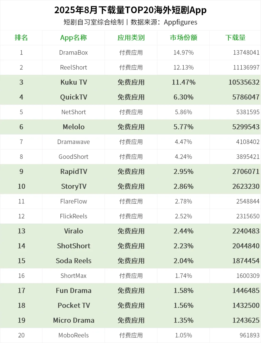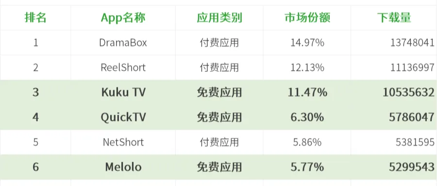 字节跳动、昆仑万维,既有内容也有资本,还率先上线了免费短剧应用;中文在线、ReelShort、点众科技、新阅时代同样手握海量版权,积累了丰富的出海经验,虽然暂未进入免费赛道,但也被视为潜在强敌。