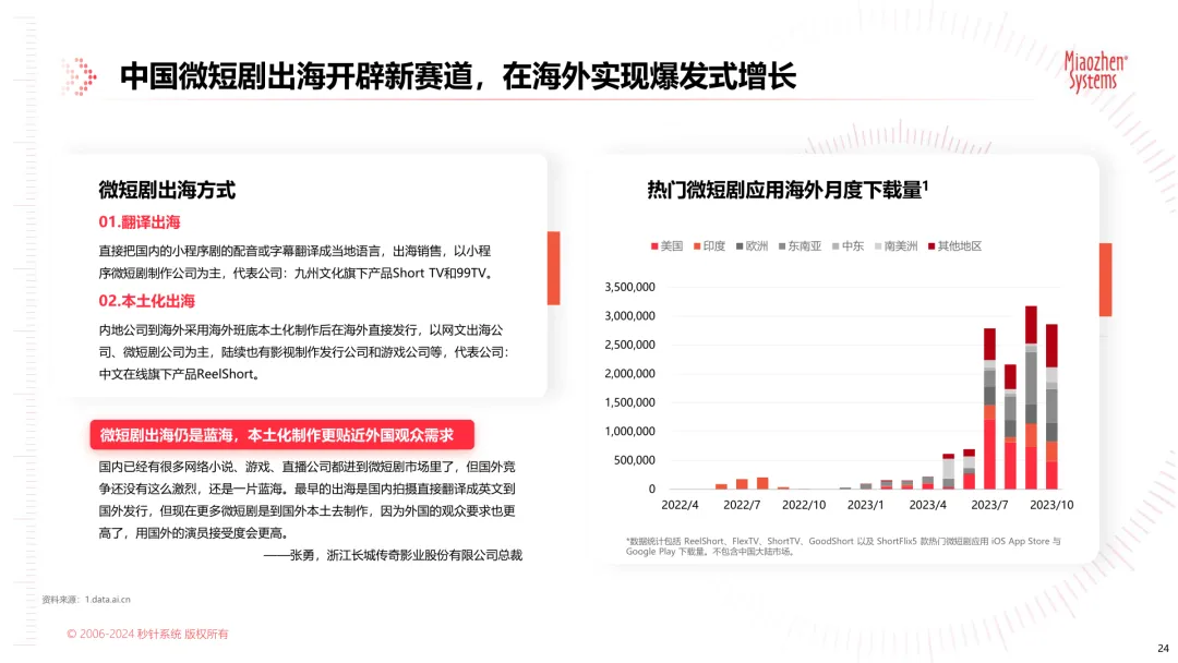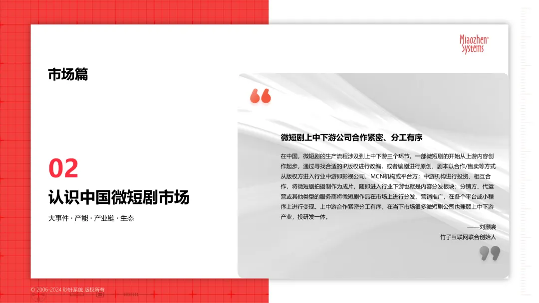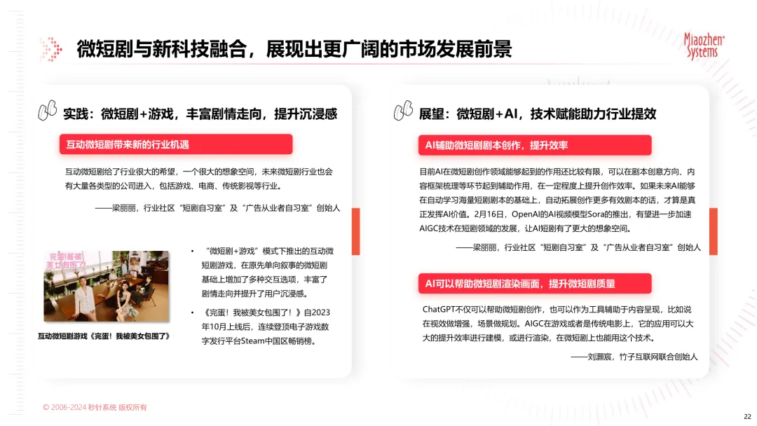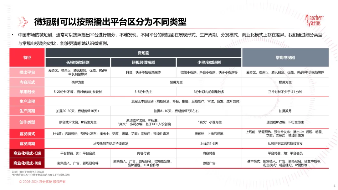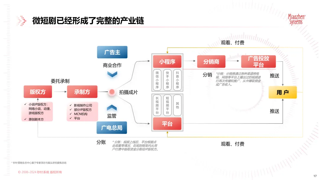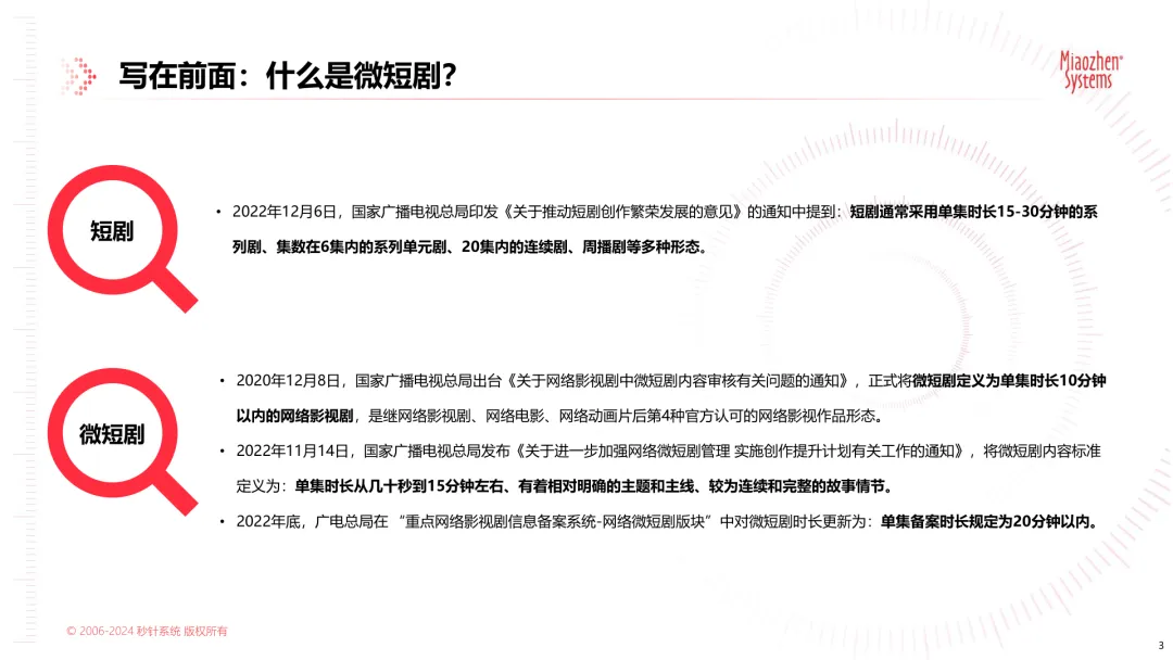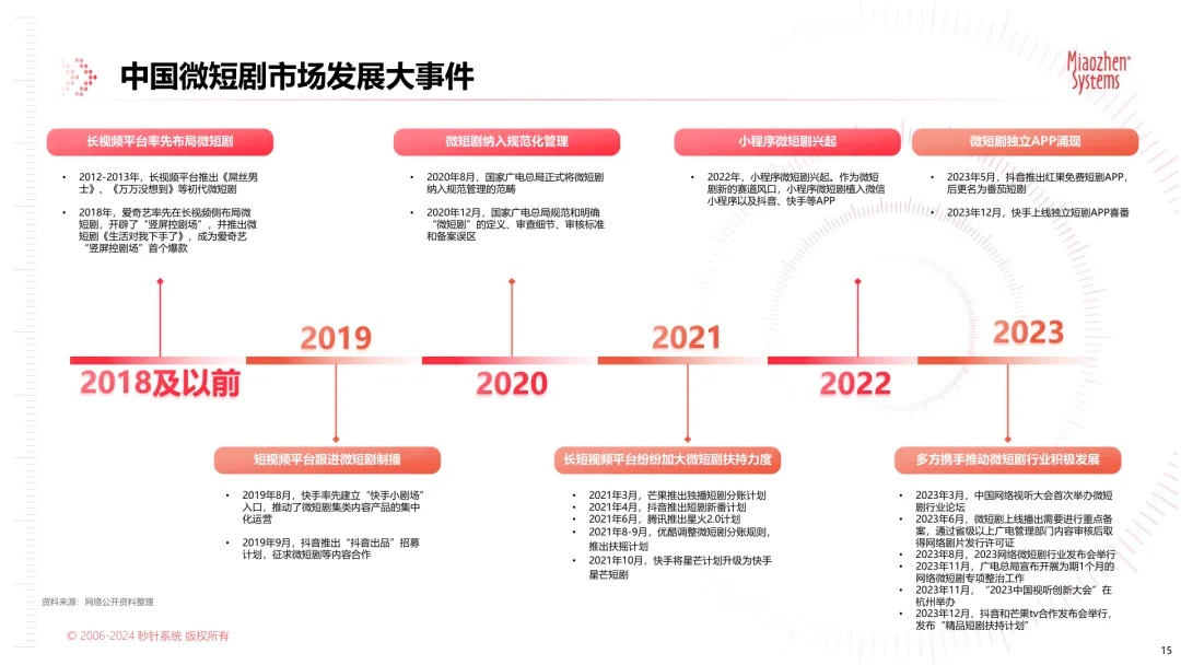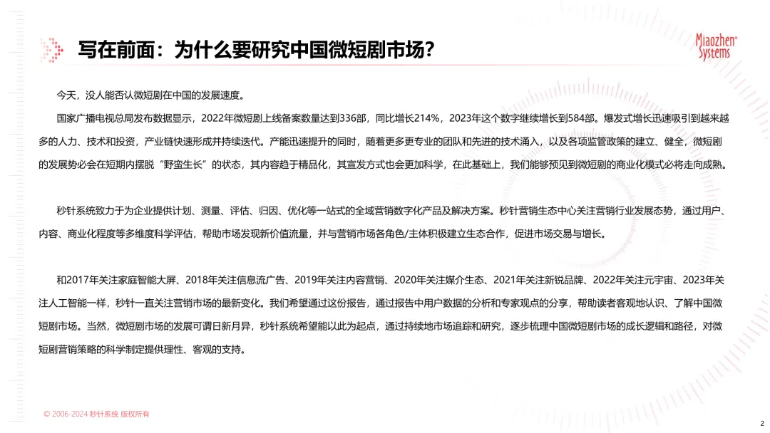 导读:数据显示,2022年微短剧上线备案数量达到336部,同比增长214%,2023年这个数字继续增长到584部。爆发式增长迅速吸引到越来越 多的人力、技术和投资,产业链快速形成并持续迭代。产能迅速提升的同时,随着更多更专业的团队和先进的技术涌入,以及各项监管政策的建立、健全,微短剧 的发展势必会在短期内摆脱“野蛮生长”的状态,其内容趋于精品化,其宣发方式也会更加科学,在此基础上,我们能够预见到微短剧的商业化模式必将走向成熟。