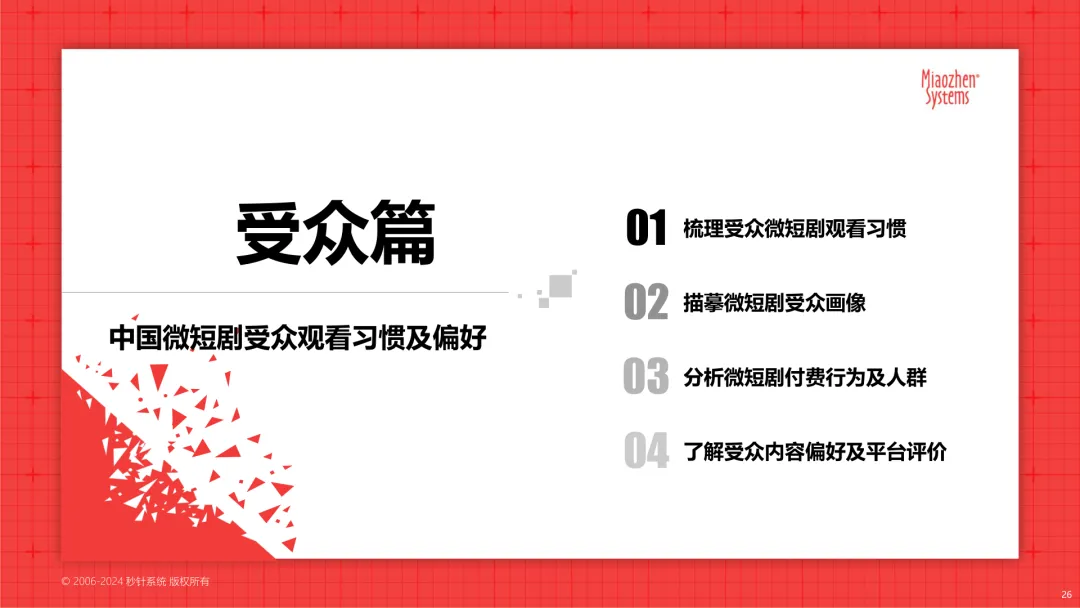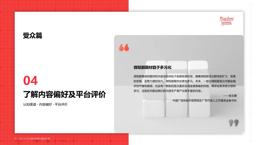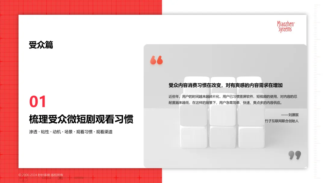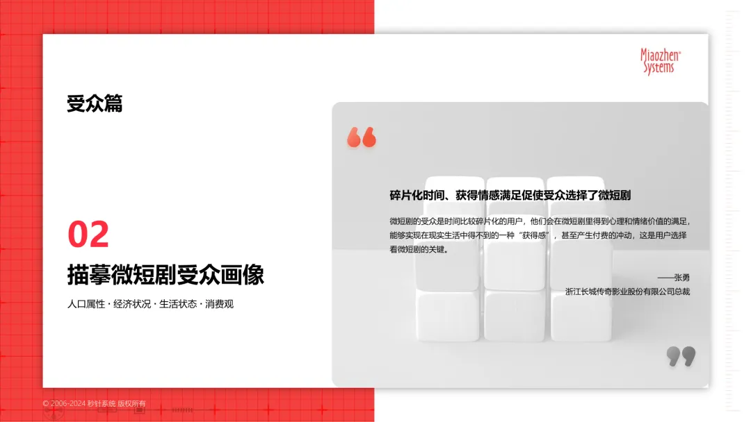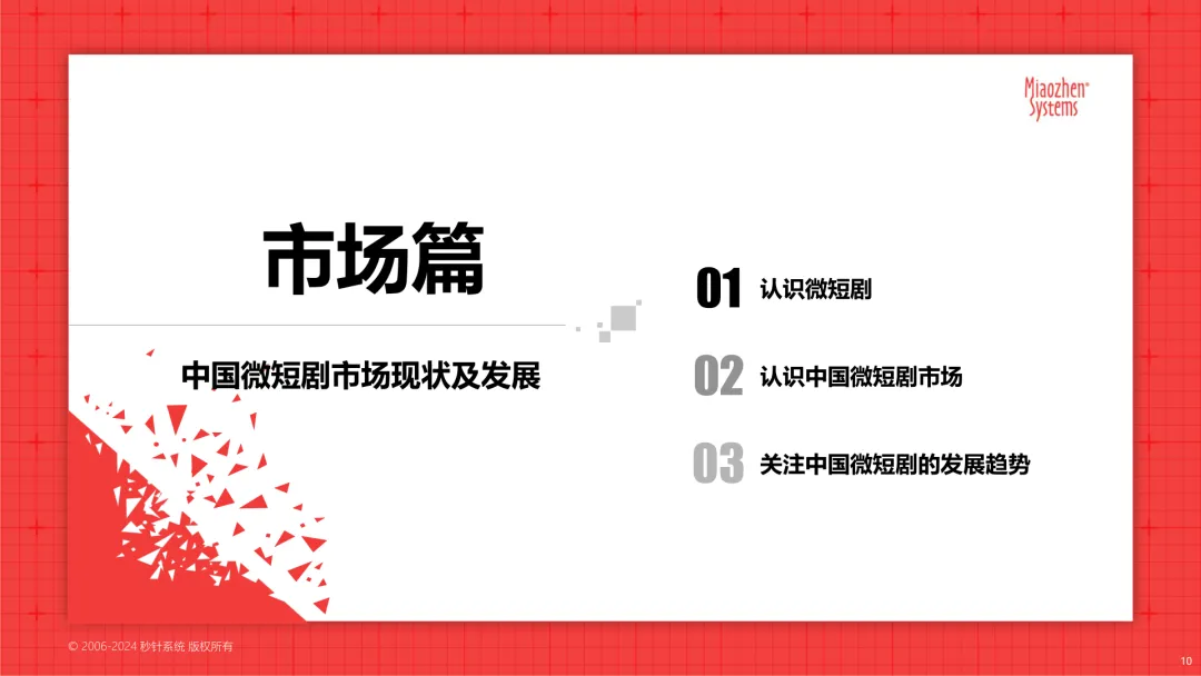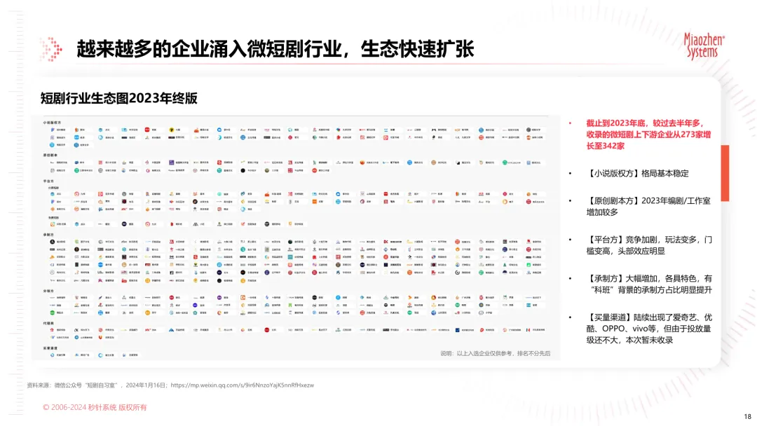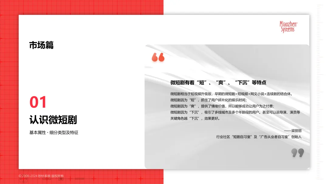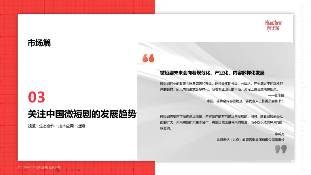 导读:数据显示,2022年微短剧上线备案数量达到336部,同比增长214%,2023年这个数字继续增长到584部。爆发式增长迅速吸引到越来越 多的人力、技术和投资,产业链快速形成并持续迭代。产能迅速提升的同时,随着更多更专业的团队和先进的技术涌入,以及各项监管政策的建立、健全,微短剧 的发展势必会在短期内摆脱“野蛮生长”的状态,其内容趋于精品化,其宣发方式也会更加科学,在此基础上,我们能够预见到微短剧的商业化模式必将走向成熟。