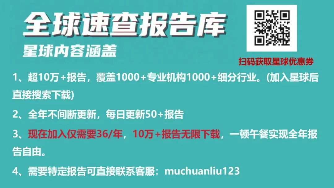 由于公众号资源受限,仅能展示部分报告,所有报告已上传“全球速查报告库”知识星球。加入星球可无限下载报告,星球包含10万+报告,涵盖全行业。客服微信:muchuanliu123