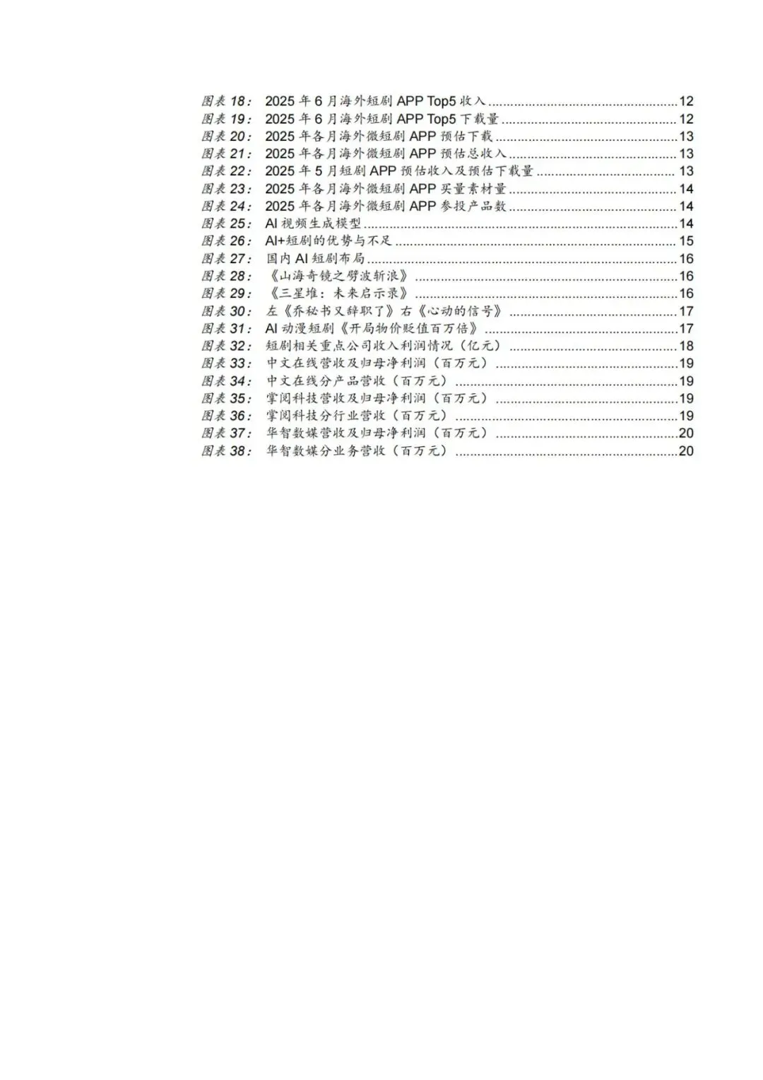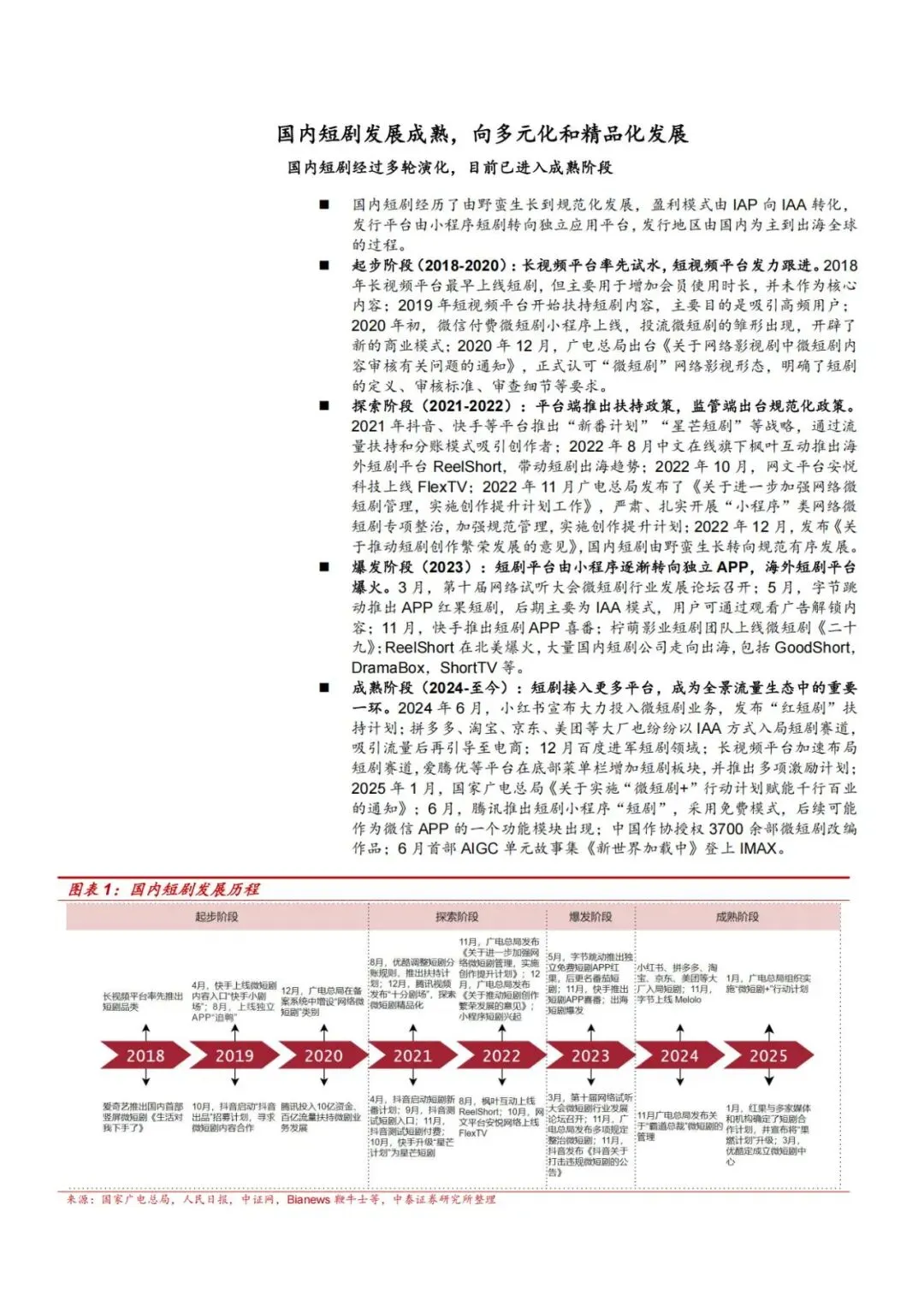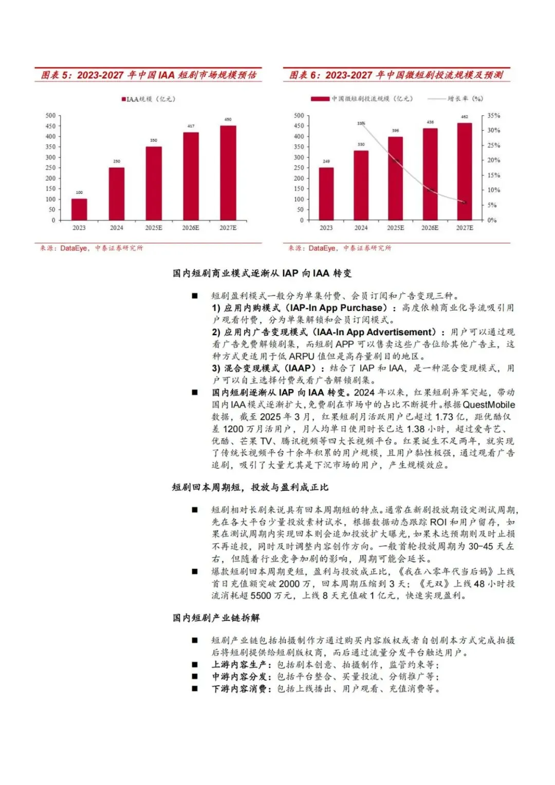 报告系统梳理中国短剧从野蛮生长到成熟精品化的完整历程,量化呈现2024年国内短剧市场规模504亿元(同比+34.9%)、用户6.62亿(渗透率59.7%)首次超越电影票房的核心拐点;拆解“IAP→IAA→IAAP”商业模式演进、30-45天快速回本机制及上游IP-中游投流-下游付费的完整产业链;前瞻分析出海“蓝海”——2025年5月海外短剧APP下载1.14亿次、收入1.23亿美元,美国占收入60%-70%,本土剧TOP20占16部;并评估AI在剧本、分镜、特效、配音全链路降本50%以上的落地进展,给出中文在线、昆仑万维等8家公司的投资排序。