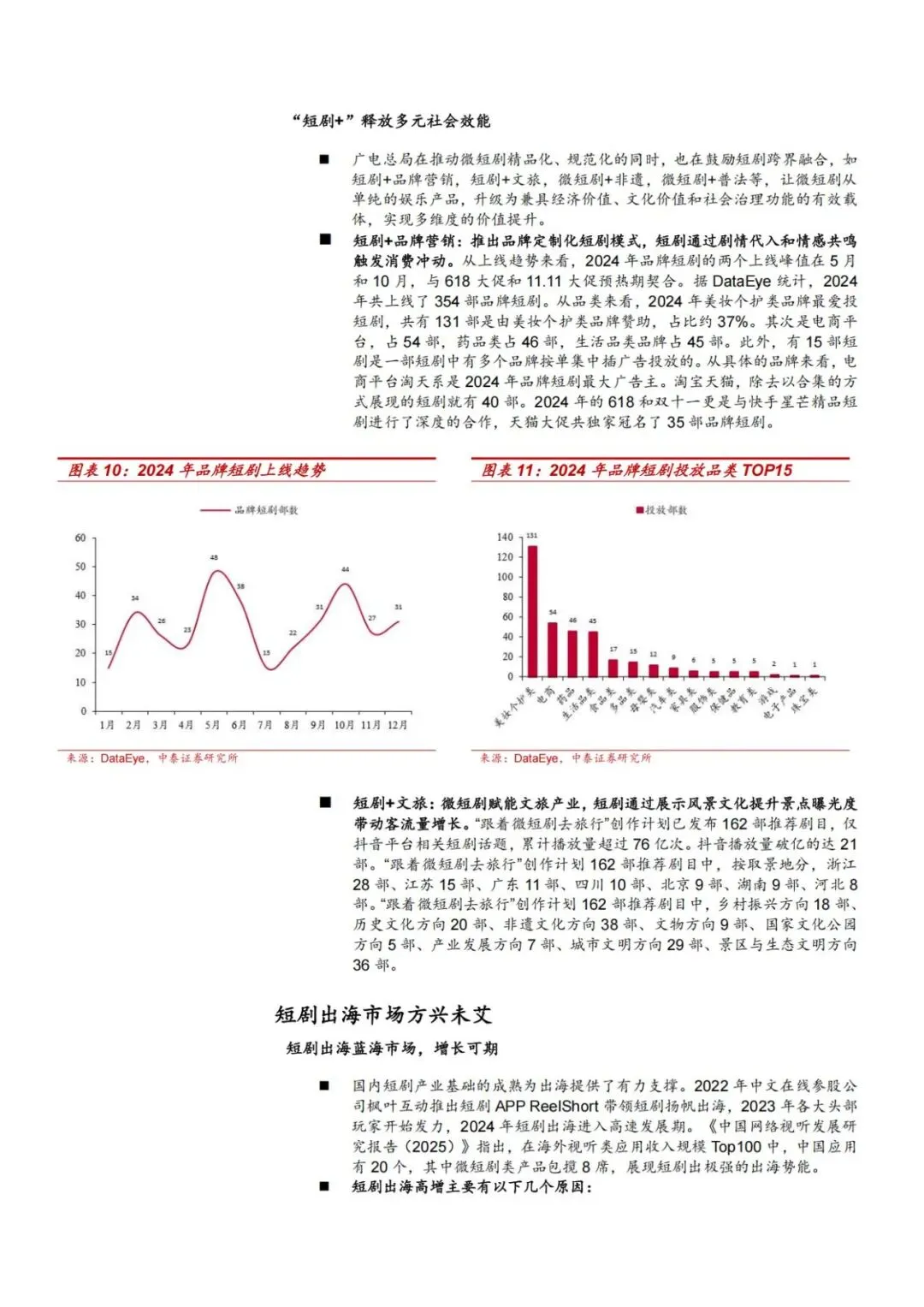 产业链上游剧本+拍摄、中游平台投流+分销、下游用户付费,2024年参与投流剧目超4.46万部。动漫短剧Q4抖音看播20亿人次、付费2600万元(+204%),素材投放2.86万组,供给约120部/月,Z世代占比60%。“短剧+”2024年上线品牌短剧354部,美妆个护占37%,淘天系独占40部;文旅短剧162部,抖音播放量76亿次,带动浙江取景28部、非遗题材38部。