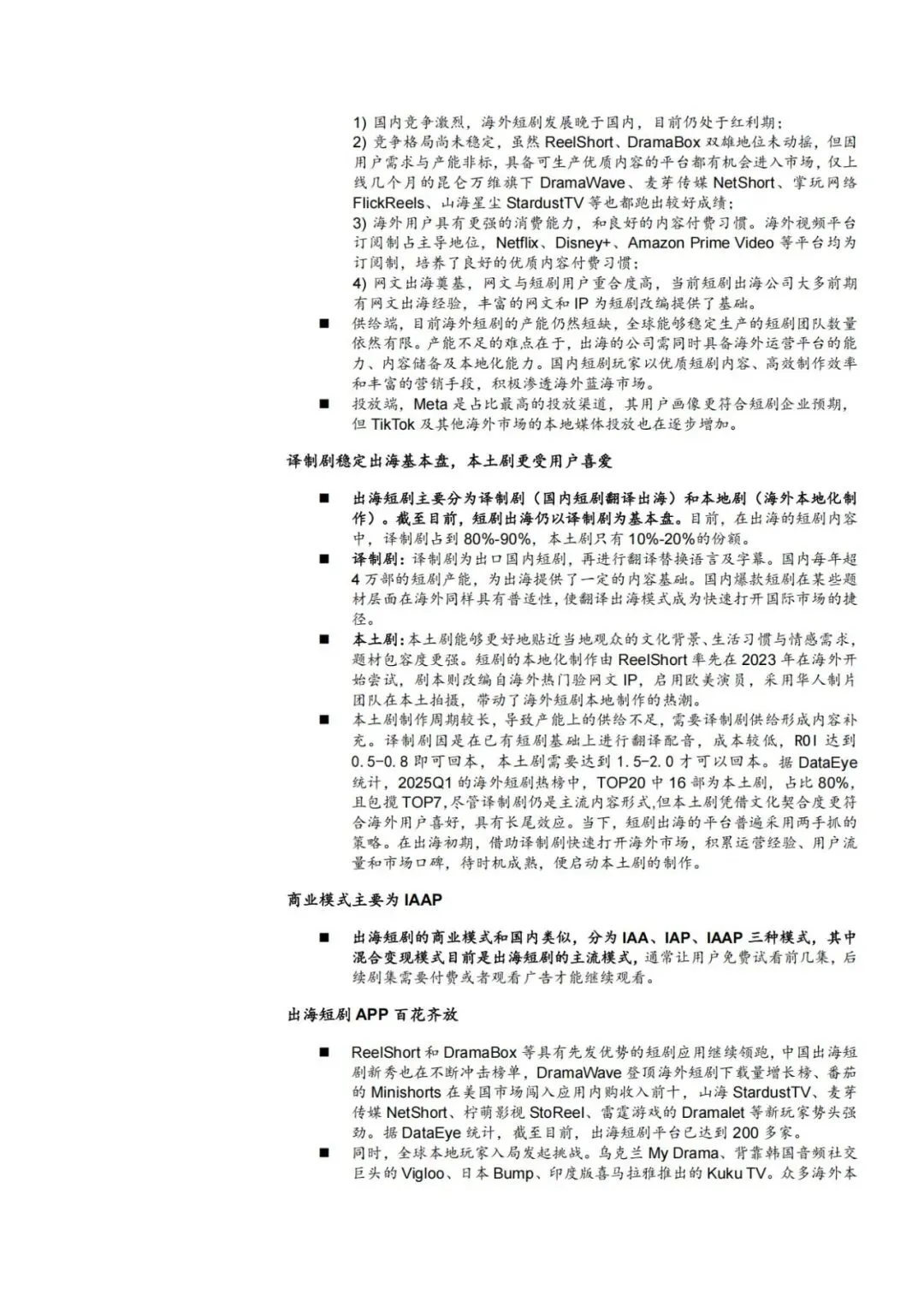 2025年5月海外短剧APP下载1.14亿次、收入1.23亿美元;美国收入5780万美元、占47%,东南亚下载2354万次、为最大流量区。TOP3应用ReelShort、DramaBox、ShortMax 2024年收入合计占56.4%。内容端译制剧仍占80%-90%,本土剧仅10%-20%,但2025Q1热榜TOP20中本土剧占16部。商业模式以IAAP混合变现为主,用户先试看后付费/看广告。出海平台已超200家,Meta为第一大买量渠道,2025年5月海外素材投放52万组、参投APP 262款。
