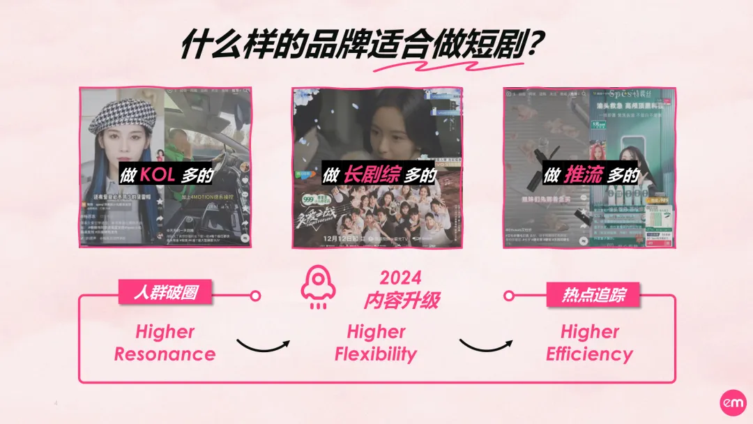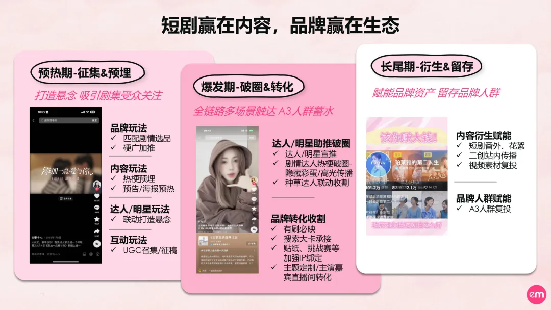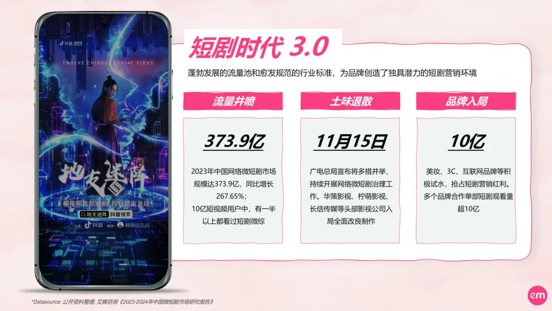 导读:报告显示,2023年,短剧市场规模超过370亿元,同比增长268%,这一数据无疑彰显了短剧营销的巨大潜能。目前短剧行业不仅摆脱了曾经的野蛮生长,更成为品牌传播与用户互动的新战场。短剧营销在各个领域崭露头角,从美妆护肤到汽车3C,通过短剧,品牌们实现了令人艳羡的市场效应,不仅观看量常破亿,还大幅提升了品牌认知度与关注度。但面对市场上类型多元、质量参差的短剧,品牌如何选择合适的赛道,成为了营销布局的关键第一步。报告显示,短剧市场每天平均上线2.7部作品,要识别真正的精品绝非易事。一部优秀的短剧,既要凝练长剧集的深度和质感,又要适应短视频的快节奏和强定制属性。