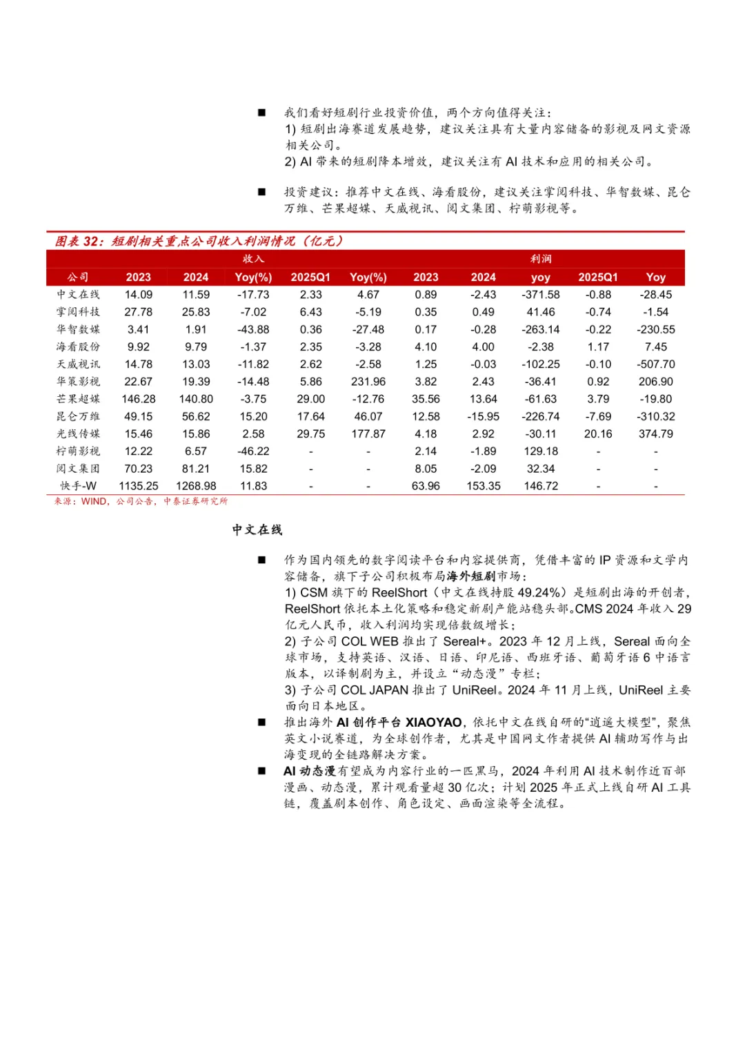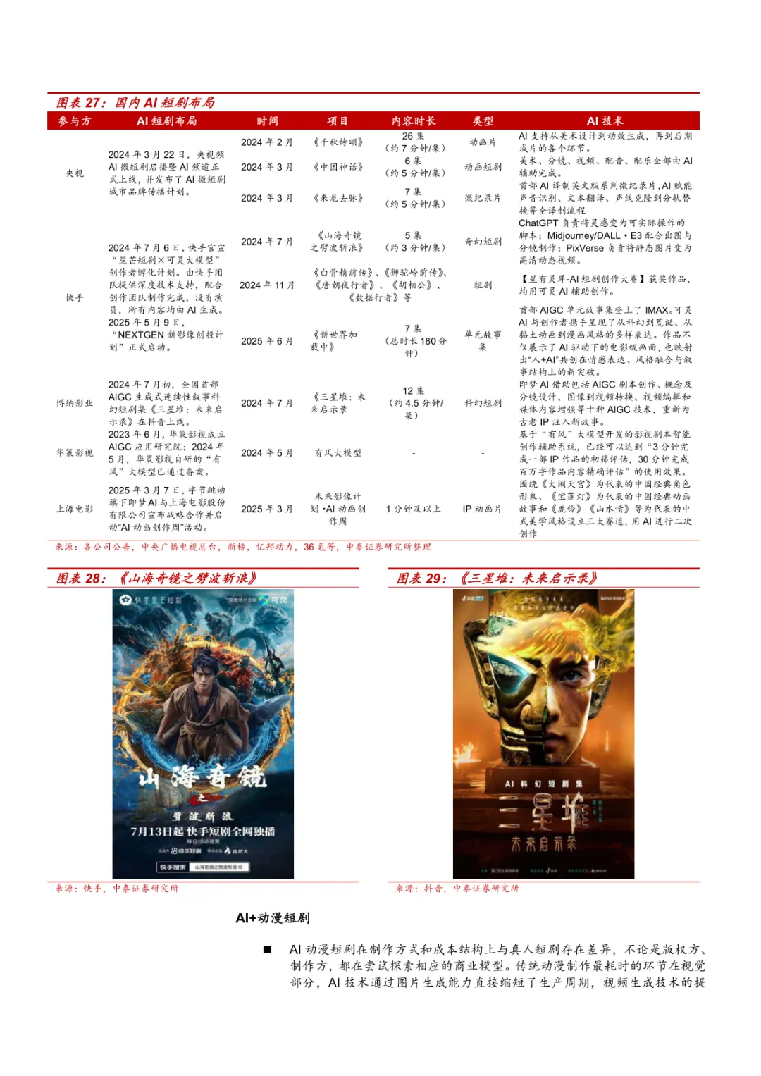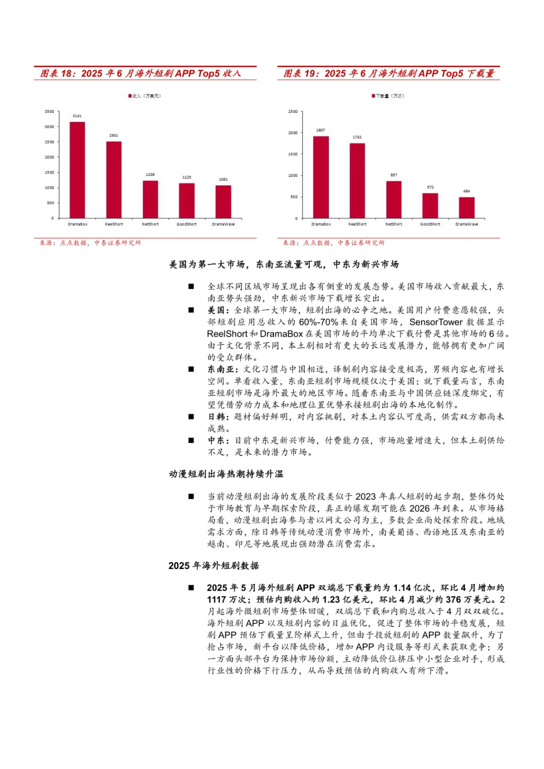 导读:报告系统梳理国内短剧发展成熟路径、出海市场机遇及 AI 技术赋能价值,为行业参与者提供方向指引。国内短剧进入成熟阶段,2024 年市场规模达 504 亿元,首超国内电影票房。用户规模 6.62 亿人,占互联网用户 59.7%。商业模式从 IAP 向 IAA 转变,2024 年 IAA 短剧市场规模 250 亿元,红果短剧月活超 1.73 亿人,用户日均使用 1.38 小时。产业链覆盖内容生产、分发与消费,动漫短剧潜力显现,2024 年 Q4 抖音动漫短剧看播超 20 亿人,Z 世代占比超 60%。“短剧 +” 模式拓展价值,2024 年上线 354 部品牌短剧,美妆个护类占比 37%;“跟着微短剧去旅行” 计划带动文旅发展,相关话题播放超 76 亿次。短剧出海呈高速增长,2024 年头部 APP 收入占比 56.4%,ReelShort、DramaBox 领跑。美国为核心市场,贡献头部 APP 60%-70% 收入;东南亚下载量领先,中东成新兴市场。商业模式以 IAAP 为主,译制剧占 80%-90%,本土剧更受青睐,2025Q1 海外热榜 TOP20 中本土剧占 80%。2025 年 5 月海外短剧 APP 下载 1.14 亿次,内购收入 1.23 亿美元,动漫短剧出海处于探索期,日韩、南美市场需求显著。