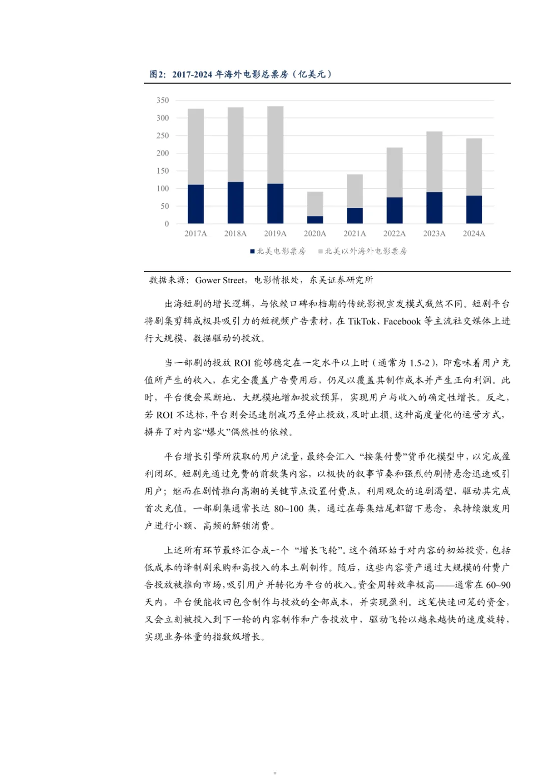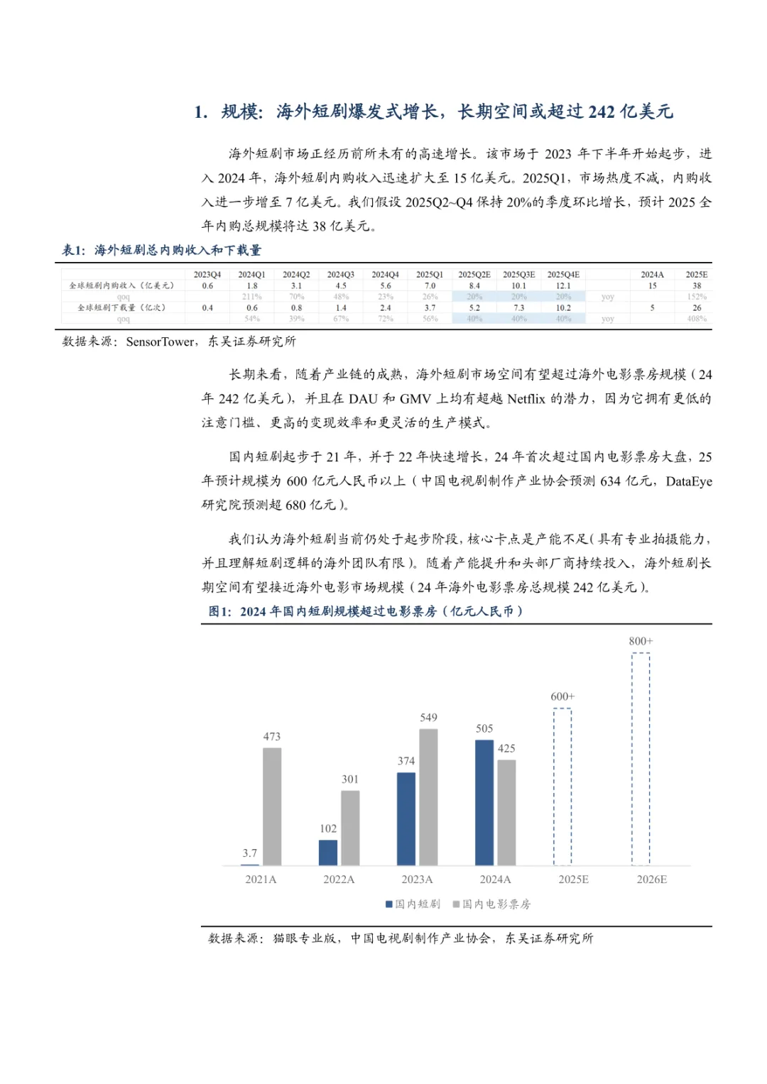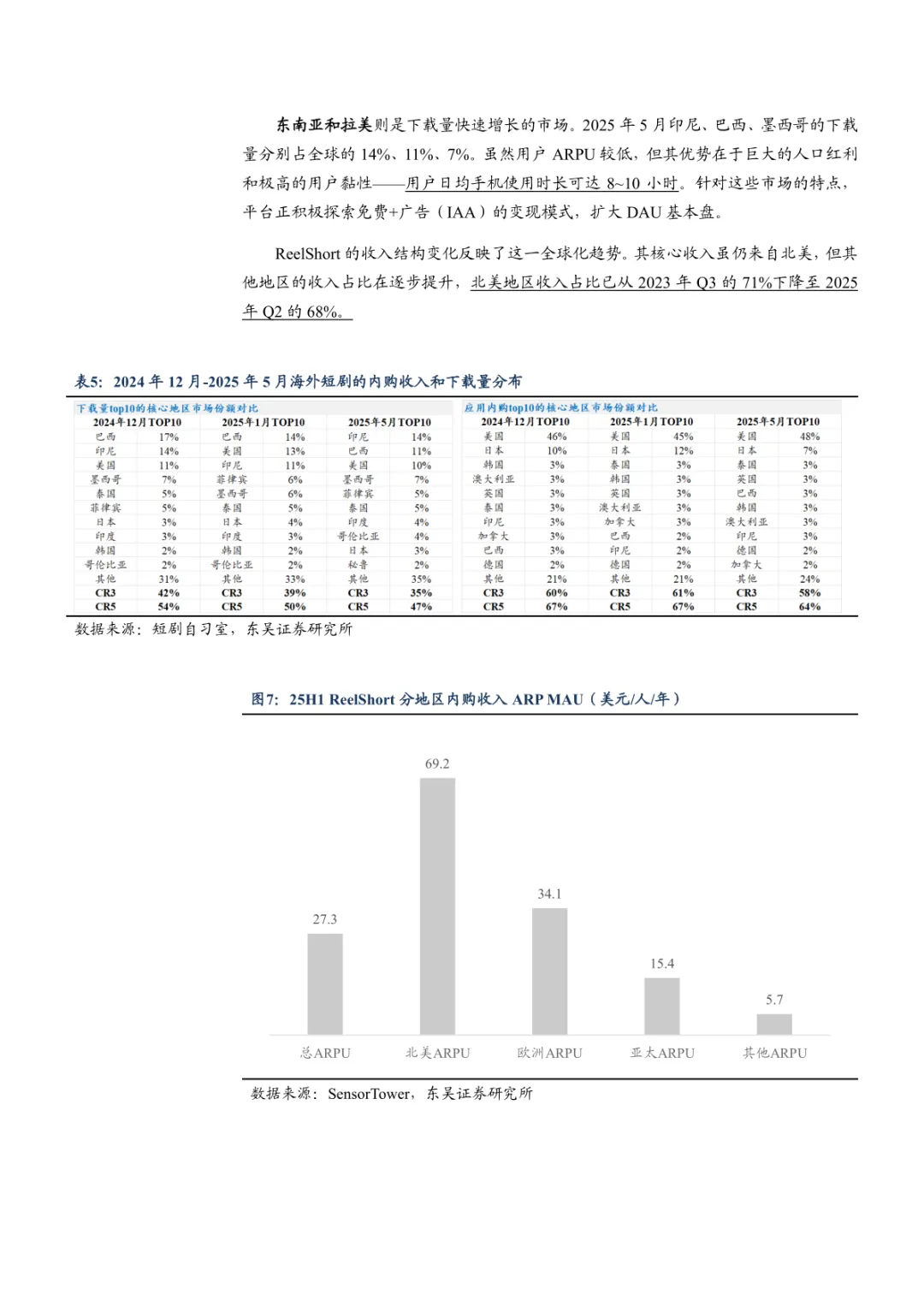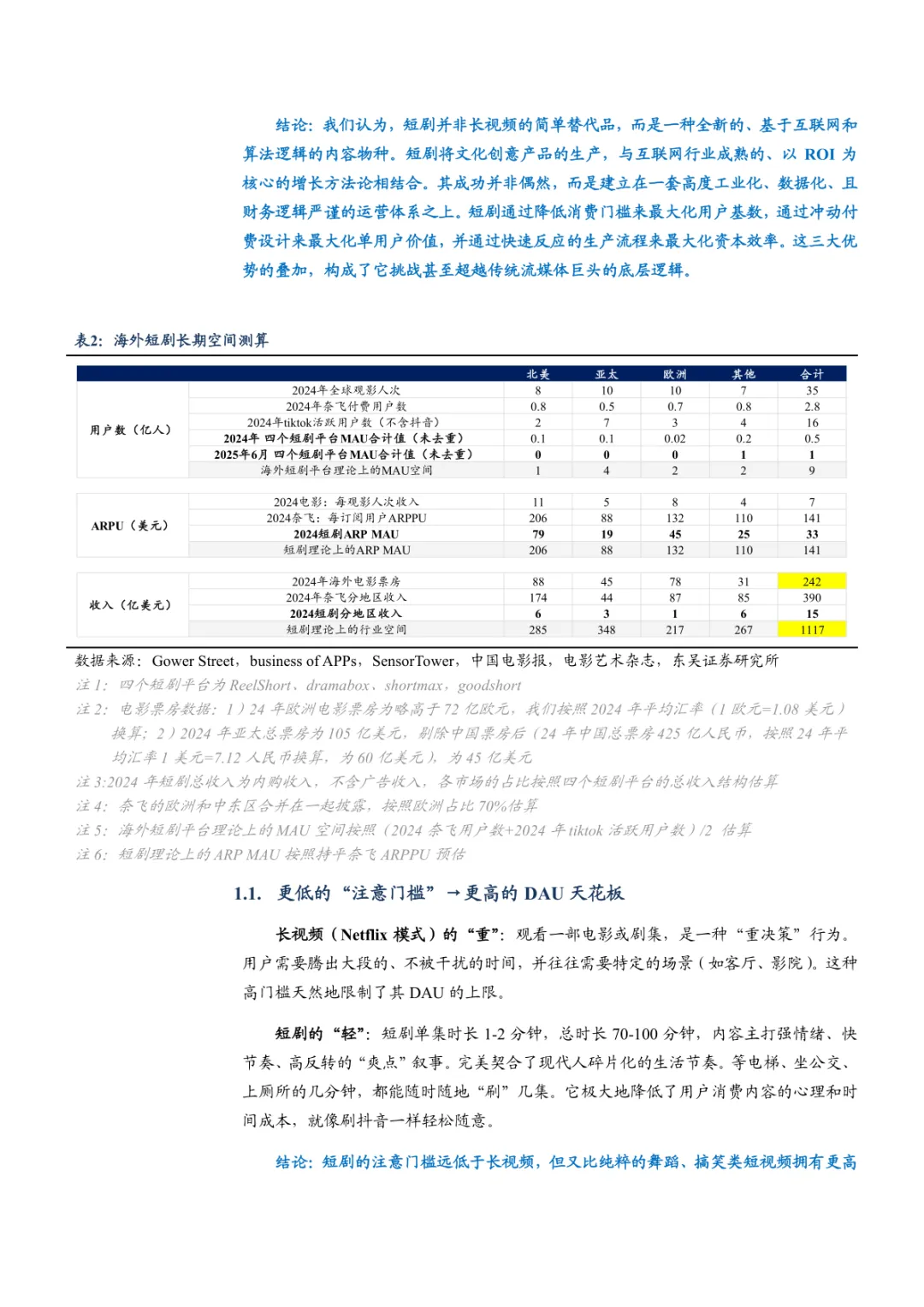 导读:报告聚焦海外短剧行业发展全貌,从规模、供需、竞争、盈利四维度展开分析,为行业参与者提供战略参考。市场规模呈爆发式增长。2024 年海外短剧内购收入达 15 亿美元,2025 年一季度增至 7 亿美元,预计全年达 38 亿美元,长期空间有望超 242 亿美元。其增长依托低注意门槛、高变现效率、灵活生产模式,DAU 天花板与 GMV 潜力均有机会超越传统流媒体。供需两端呈现差异化特征。需求侧通过拓展男性用户、加速全球渗透(北美贡献核心收入,东南亚下载量快速增长)、推广 IAA 模式吸引低收入群体,持续扩大用户基数。供给侧受人才瓶颈、工作时长限制、IP 储备真空影响,有效产能稀缺,头部平台通过吸纳好莱坞溢出资源、探索 “国内制作海外发行” 模式突破产能瓶颈。