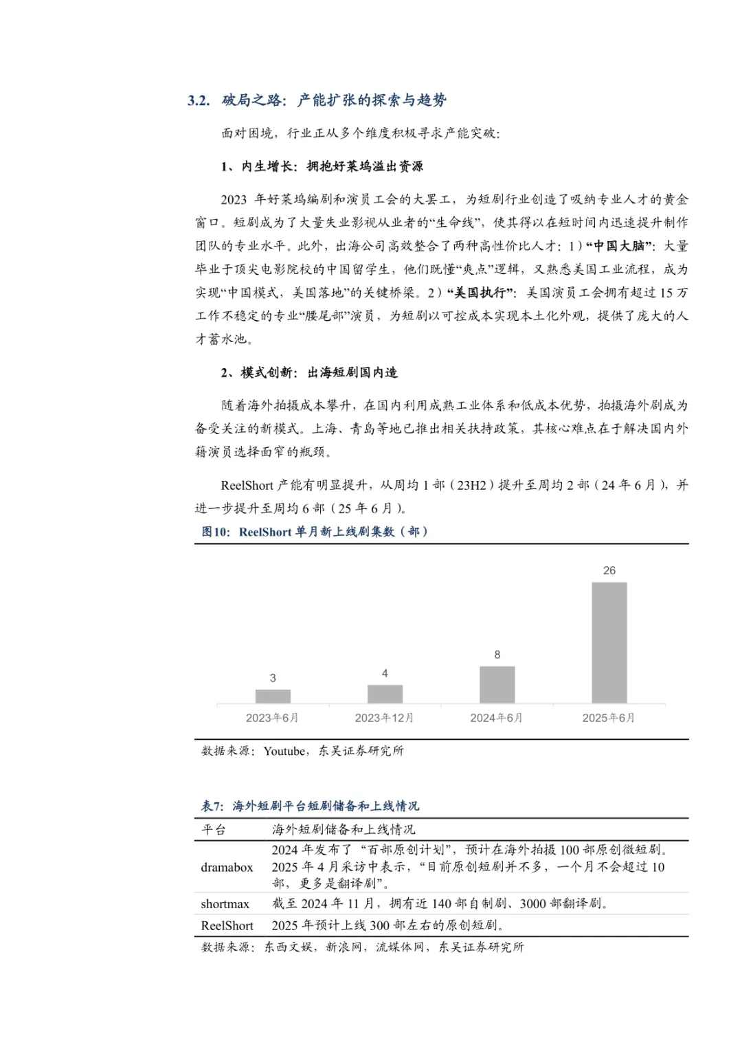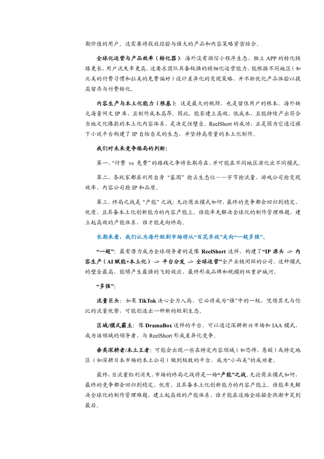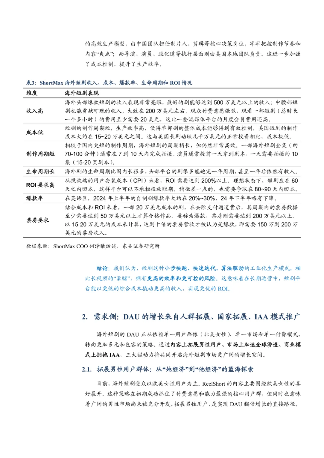 导读:报告聚焦海外短剧行业发展全貌,从规模、供需、竞争、盈利四维度展开分析,为行业参与者提供战略参考。市场规模呈爆发式增长。2024 年海外短剧内购收入达 15 亿美元,2025 年一季度增至 7 亿美元,预计全年达 38 亿美元,长期空间有望超 242 亿美元。其增长依托低注意门槛、高变现效率、灵活生产模式,DAU 天花板与 GMV 潜力均有机会超越传统流媒体。供需两端呈现差异化特征。需求侧通过拓展男性用户、加速全球渗透(北美贡献核心收入,东南亚下载量快速增长)、推广 IAA 模式吸引低收入群体,持续扩大用户基数。供给侧受人才瓶颈、工作时长限制、IP 储备真空影响,有效产能稀缺,头部平台通过吸纳好莱坞溢出资源、探索 “国内制作海外发行” 模式突破产能瓶颈。