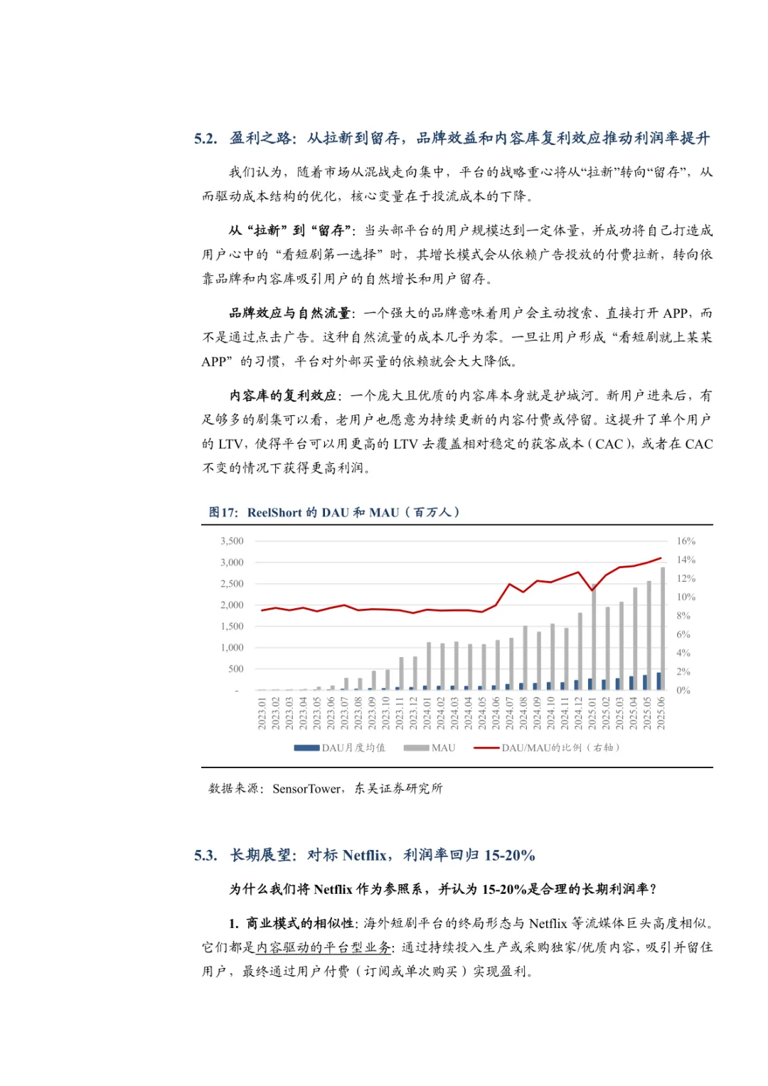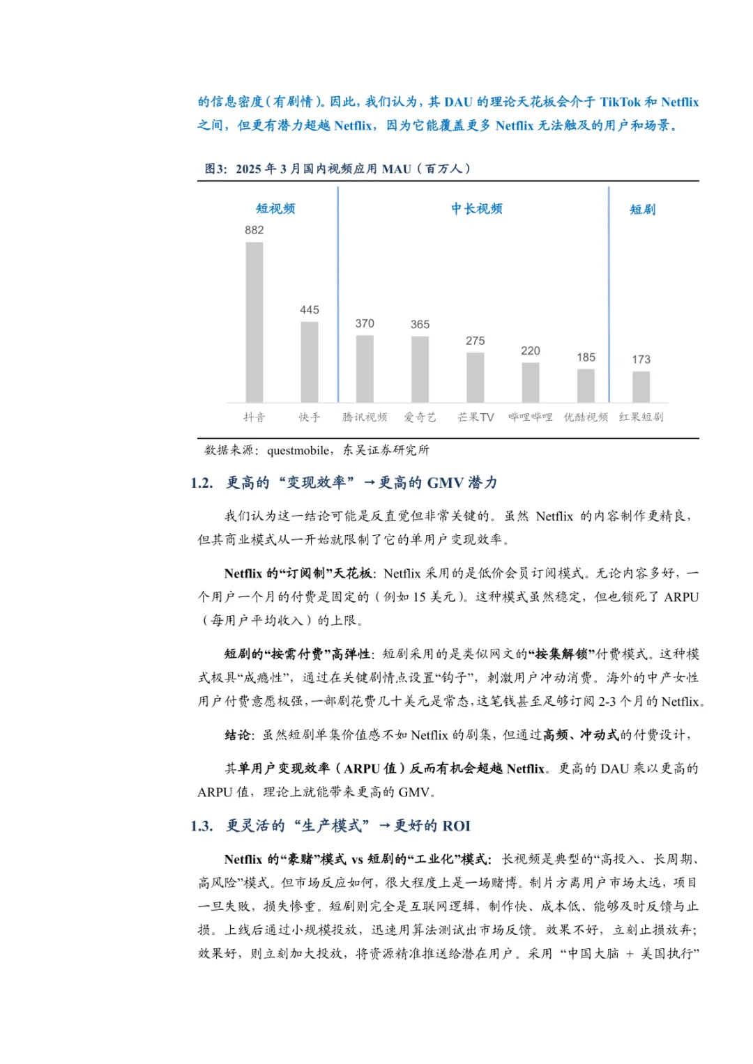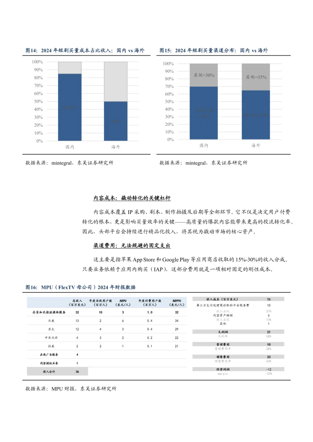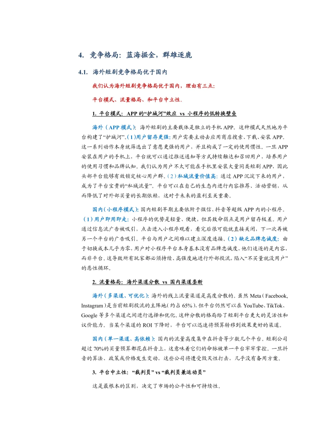 导读:报告聚焦海外短剧行业发展全貌,从规模、供需、竞争、盈利四维度展开分析,为行业参与者提供战略参考。市场规模呈爆发式增长。2024 年海外短剧内购收入达 15 亿美元,2025 年一季度增至 7 亿美元,预计全年达 38 亿美元,长期空间有望超 242 亿美元。其增长依托低注意门槛、高变现效率、灵活生产模式,DAU 天花板与 GMV 潜力均有机会超越传统流媒体。供需两端呈现差异化特征。需求侧通过拓展男性用户、加速全球渗透(北美贡献核心收入,东南亚下载量快速增长)、推广 IAA 模式吸引低收入群体,持续扩大用户基数。供给侧受人才瓶颈、工作时长限制、IP 储备真空影响,有效产能稀缺,头部平台通过吸纳好莱坞溢出资源、探索 “国内制作海外发行” 模式突破产能瓶颈。