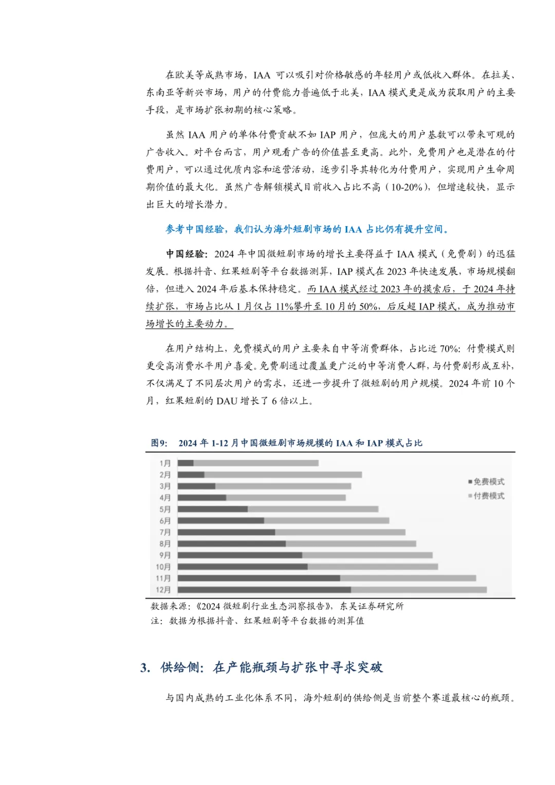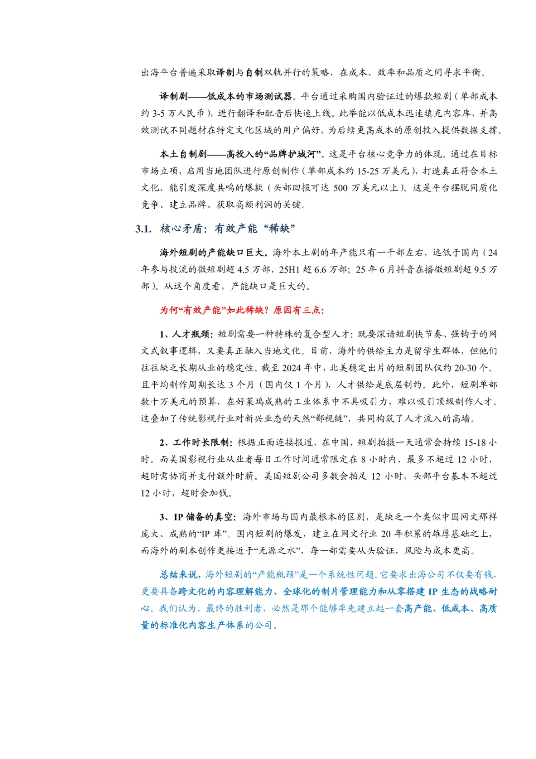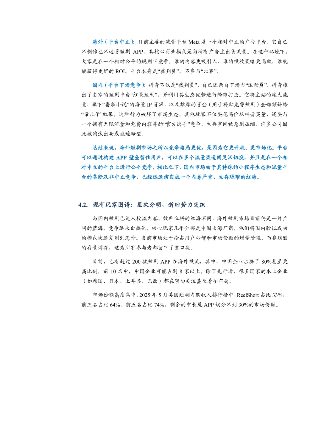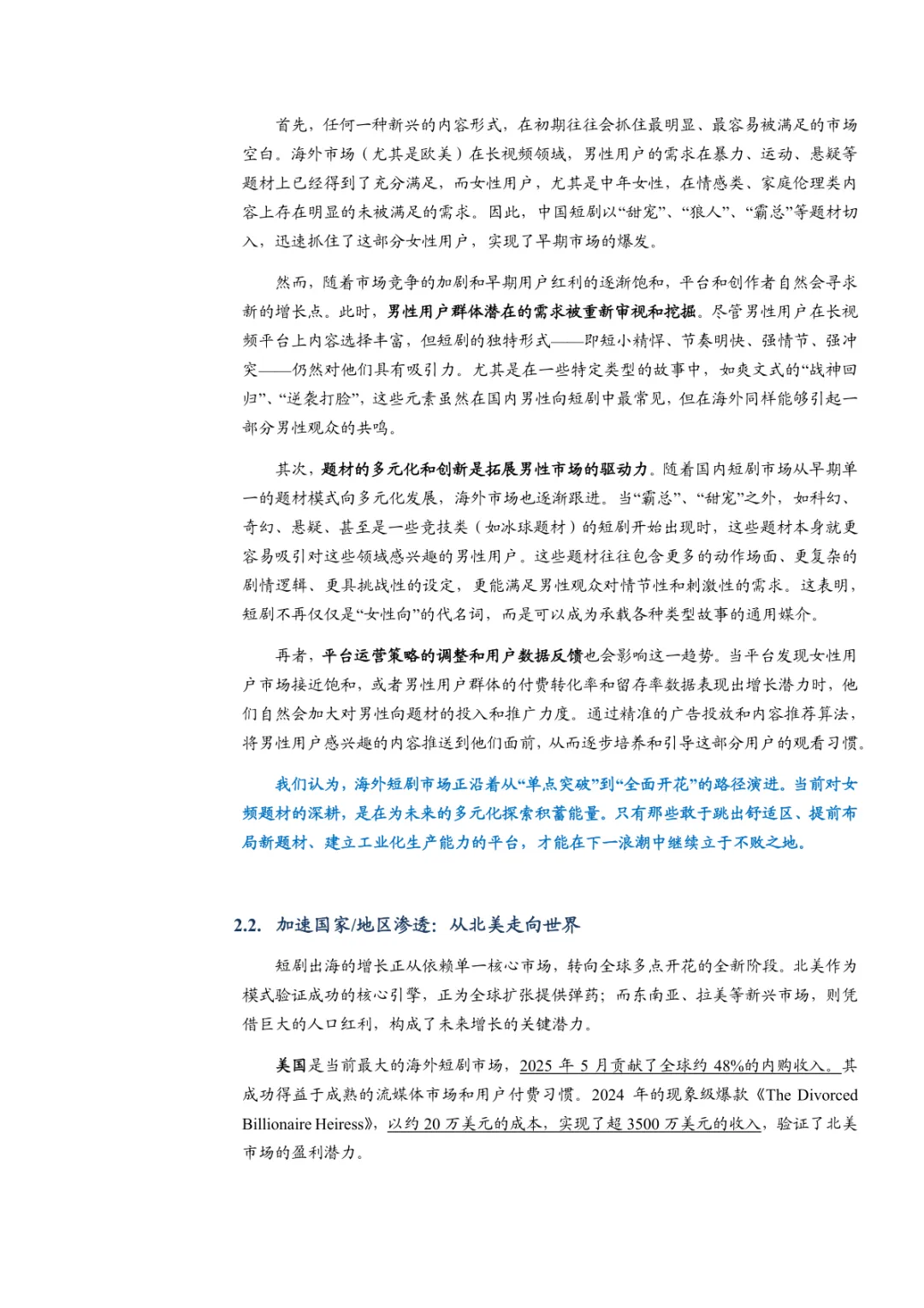 导读:报告聚焦海外短剧行业发展全貌,从规模、供需、竞争、盈利四维度展开分析,为行业参与者提供战略参考。市场规模呈爆发式增长。2024 年海外短剧内购收入达 15 亿美元,2025 年一季度增至 7 亿美元,预计全年达 38 亿美元,长期空间有望超 242 亿美元。其增长依托低注意门槛、高变现效率、灵活生产模式,DAU 天花板与 GMV 潜力均有机会超越传统流媒体。供需两端呈现差异化特征。需求侧通过拓展男性用户、加速全球渗透(北美贡献核心收入,东南亚下载量快速增长)、推广 IAA 模式吸引低收入群体,持续扩大用户基数。供给侧受人才瓶颈、工作时长限制、IP 储备真空影响,有效产能稀缺,头部平台通过吸纳好莱坞溢出资源、探索 “国内制作海外发行” 模式突破产能瓶颈。