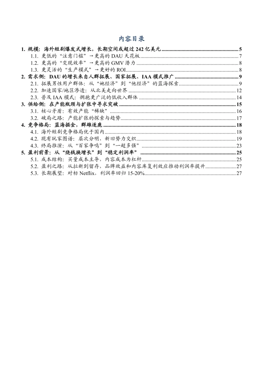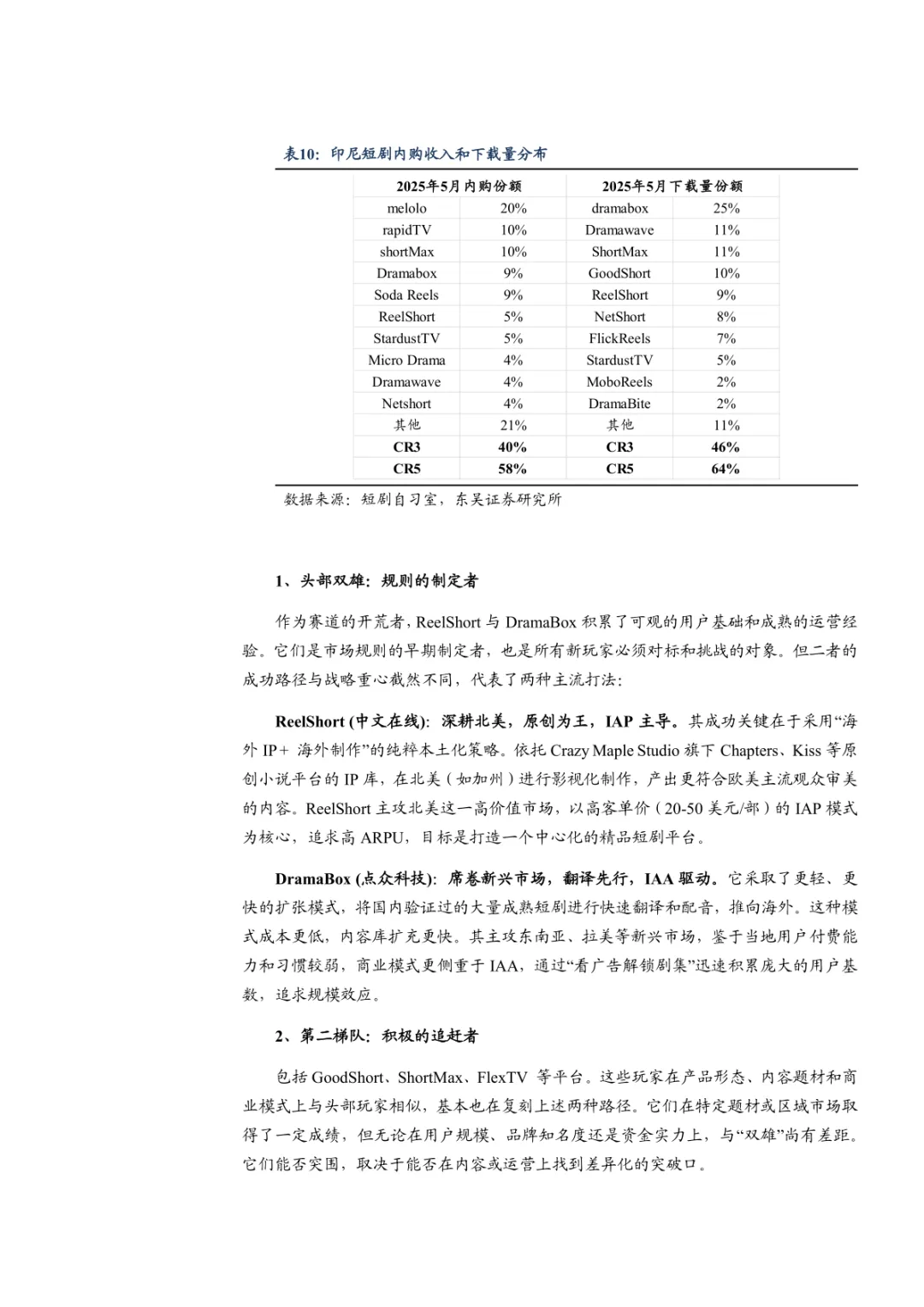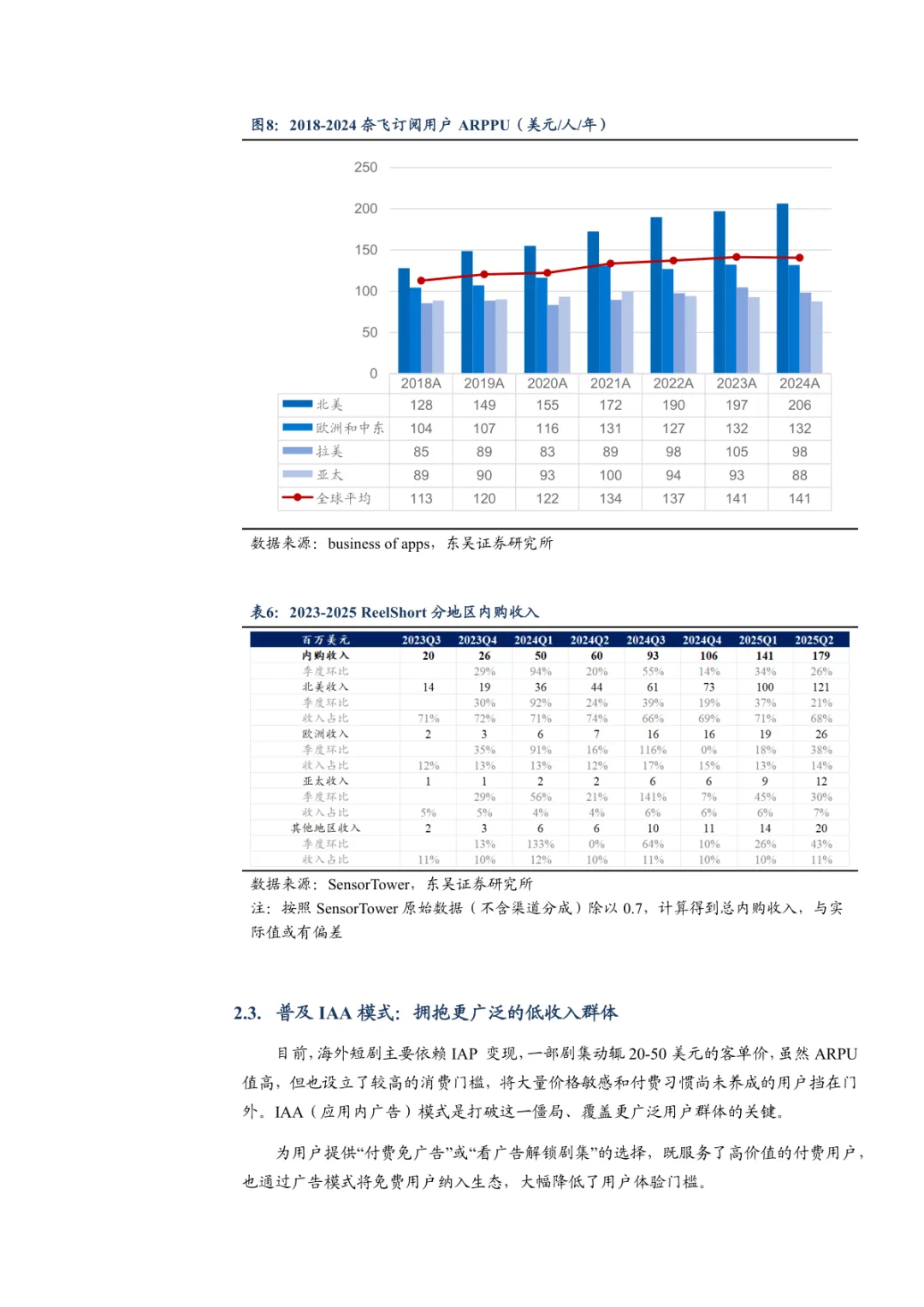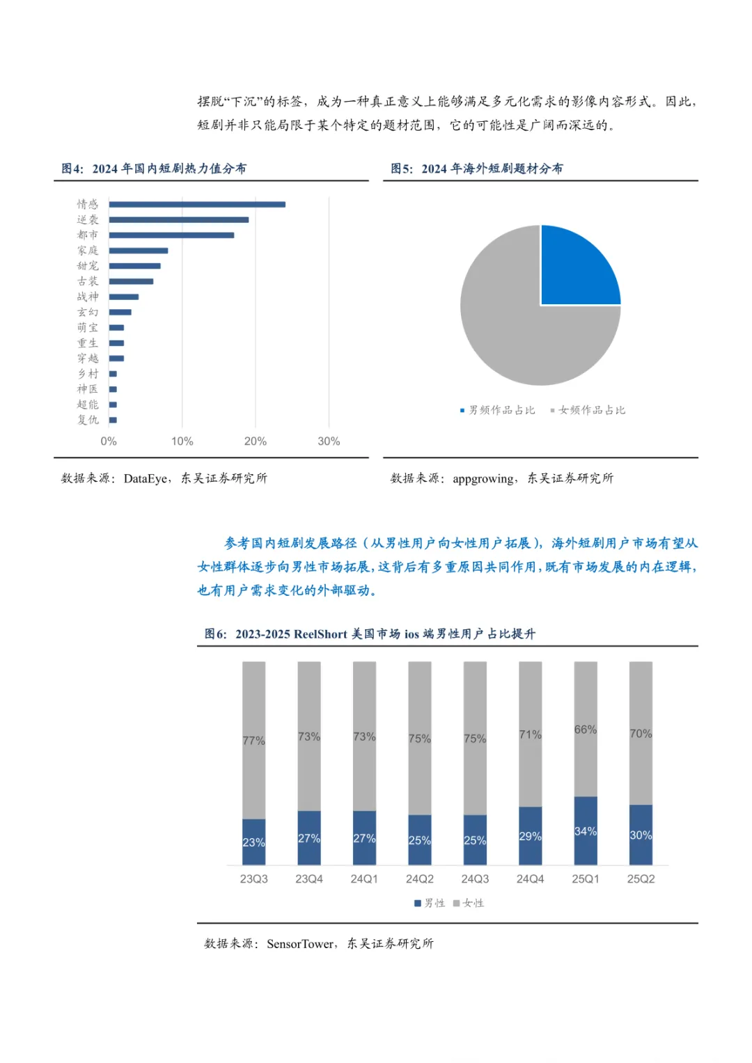 导读:报告聚焦海外短剧行业发展全貌,从规模、供需、竞争、盈利四维度展开分析,为行业参与者提供战略参考。市场规模呈爆发式增长。2024 年海外短剧内购收入达 15 亿美元,2025 年一季度增至 7 亿美元,预计全年达 38 亿美元,长期空间有望超 242 亿美元。其增长依托低注意门槛、高变现效率、灵活生产模式,DAU 天花板与 GMV 潜力均有机会超越传统流媒体。供需两端呈现差异化特征。需求侧通过拓展男性用户、加速全球渗透(北美贡献核心收入,东南亚下载量快速增长)、推广 IAA 模式吸引低收入群体,持续扩大用户基数。供给侧受人才瓶颈、工作时长限制、IP 储备真空影响,有效产能稀缺,头部平台通过吸纳好莱坞溢出资源、探索 “国内制作海外发行” 模式突破产能瓶颈。