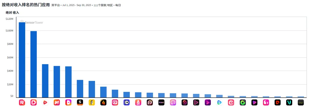 本季度收入榜单呈现 "头部稳固、中部突围" 的格局。ReelShort与DramaBox构成绝对第一梯队,单季度收入总和超 2 亿美元,合计占据全球短剧市场 38% 以上的收入份额。