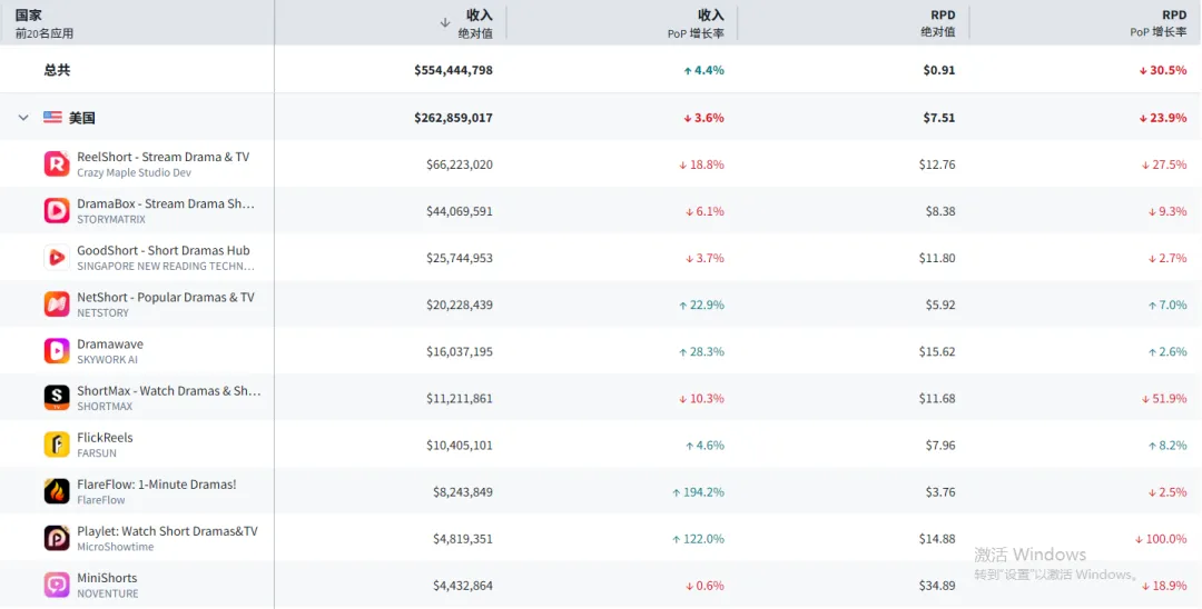 美国仍以 47% 的收入占比稳居榜首,实现收入 2.62 亿美元,环比下降 3.6%,RPD 值(每次下载收入)较上季度下降23.9%。本季度美国收入榜前10应用均出自中国团队,其中FlareFlow和Playlet表现尤为亮眼,分别位列第八和第九。