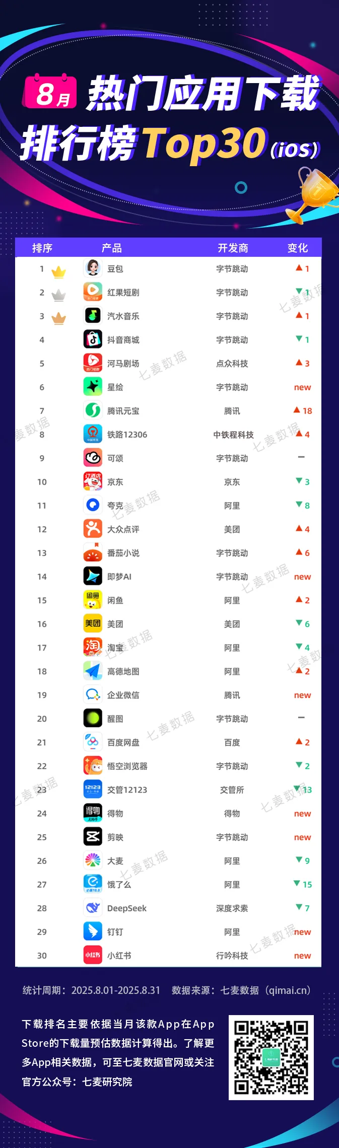 在8月热门应用下载榜Top30中,字节跳动旗下产品展现出强劲爆发力,「豆包」「红果短剧」「汽水音乐」成功包揽Top3席位。
