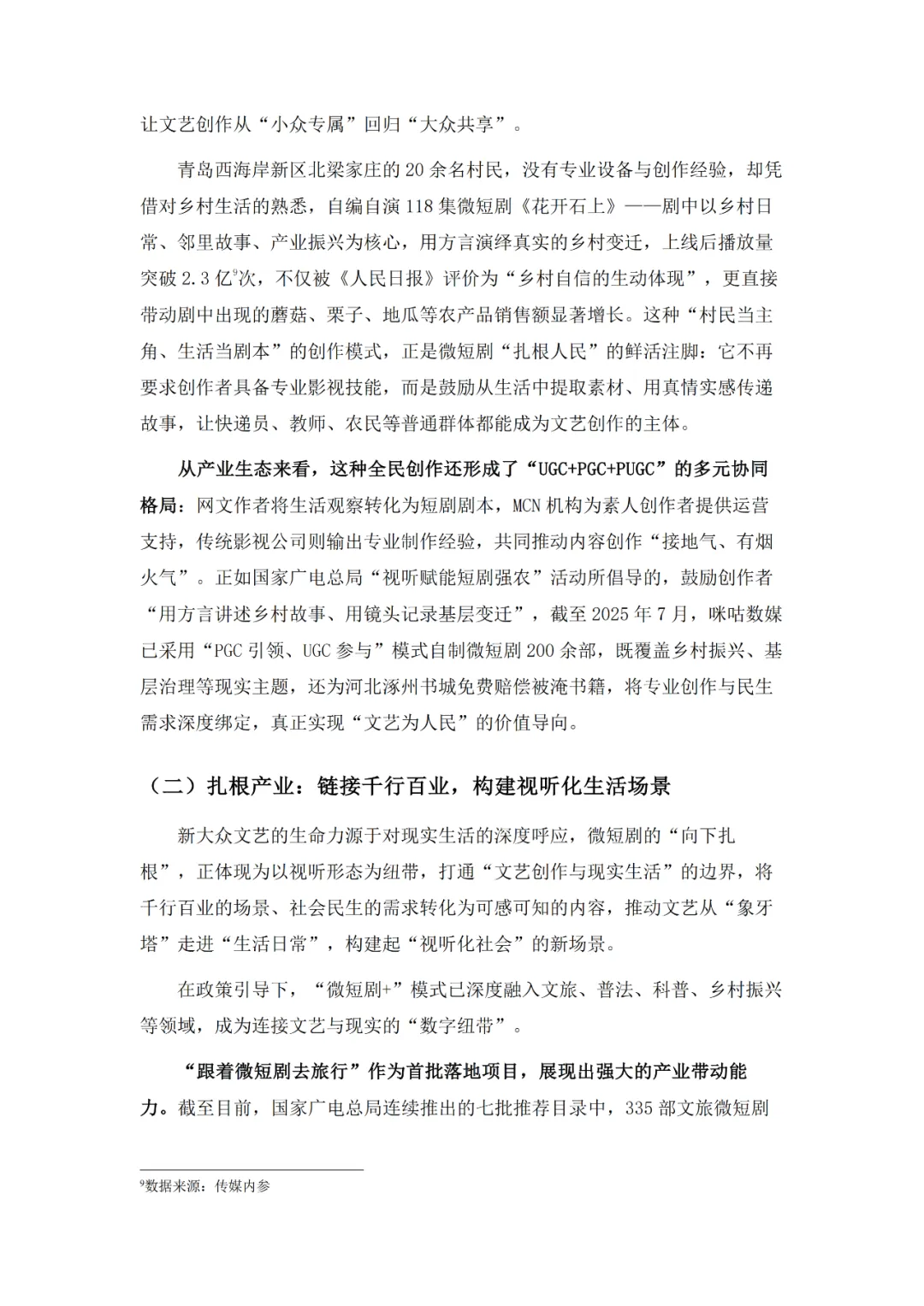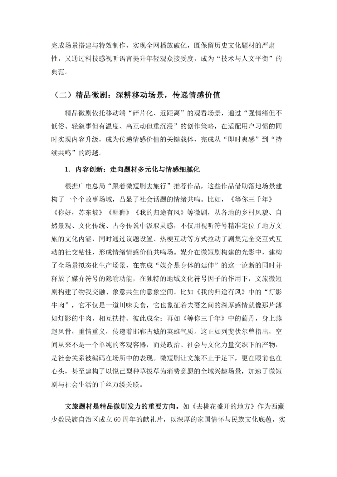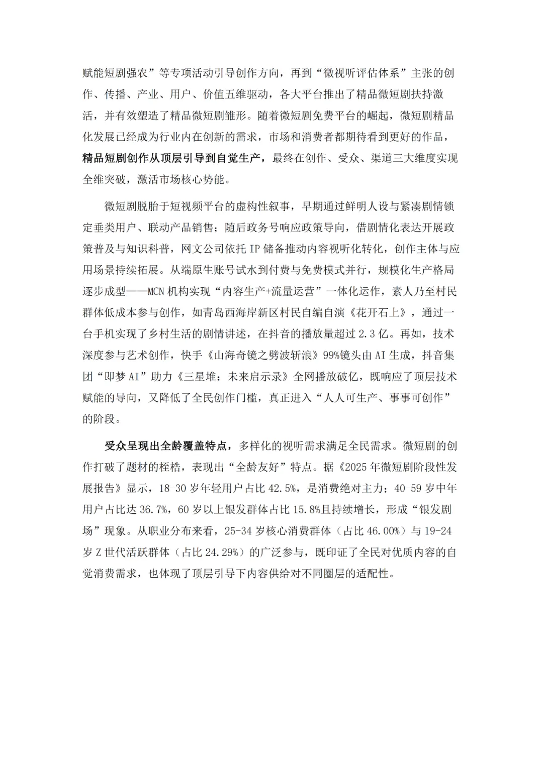 作为新大众文艺的代表,微短剧在广电总局政策引导下实现了从情绪刺激到情感共鸣再到价值沉淀的三级跃迁,如今正朝着细糠短剧式的精品化方向深耕,题材覆盖普法、传统文化、乡村振兴等多元领域。产业端与文旅、品牌营销等千行百业深度融合,“一剧带一景”等模式渐成主流,吸引了占比24.29%的Z世代等广泛受众参与。不过行业仍面临盗版侵权、创作动力续航、AIGC技术冲击等挑战,需通过内容深耕、产业协同、技术赋能等路径推进生态共建,实现长远发展。