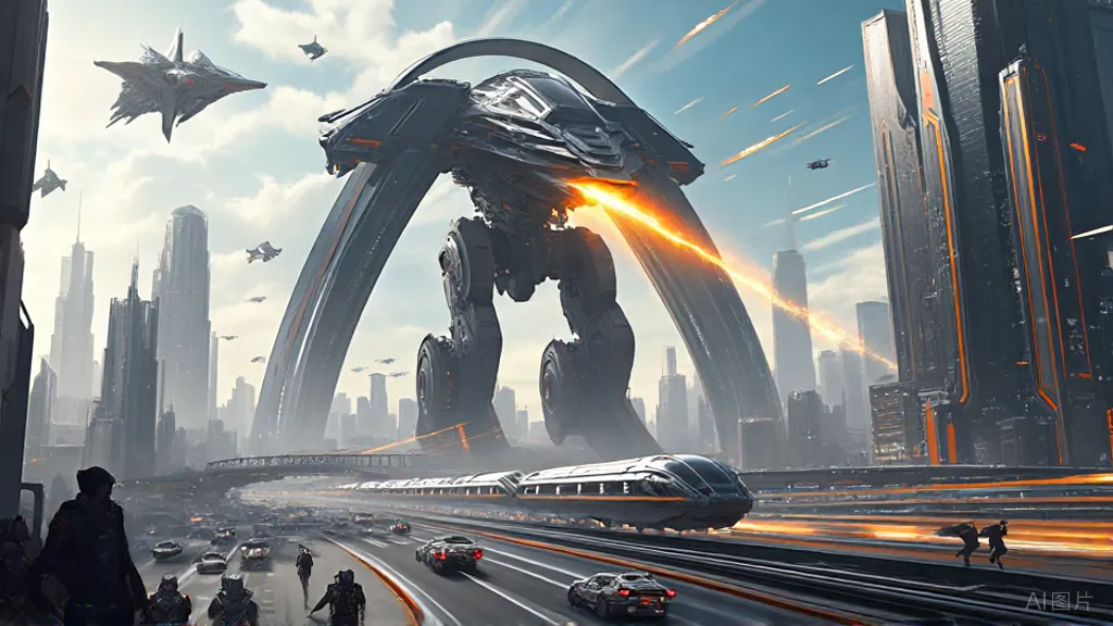 • 还呈现了有着巨大拱形建筑的未来城市景观,建筑风格充满科技感,空中有众多飞行器,地面上有车辆和行人,整体呈现出一个高度发达、充满科幻元素的未来都市风貌。