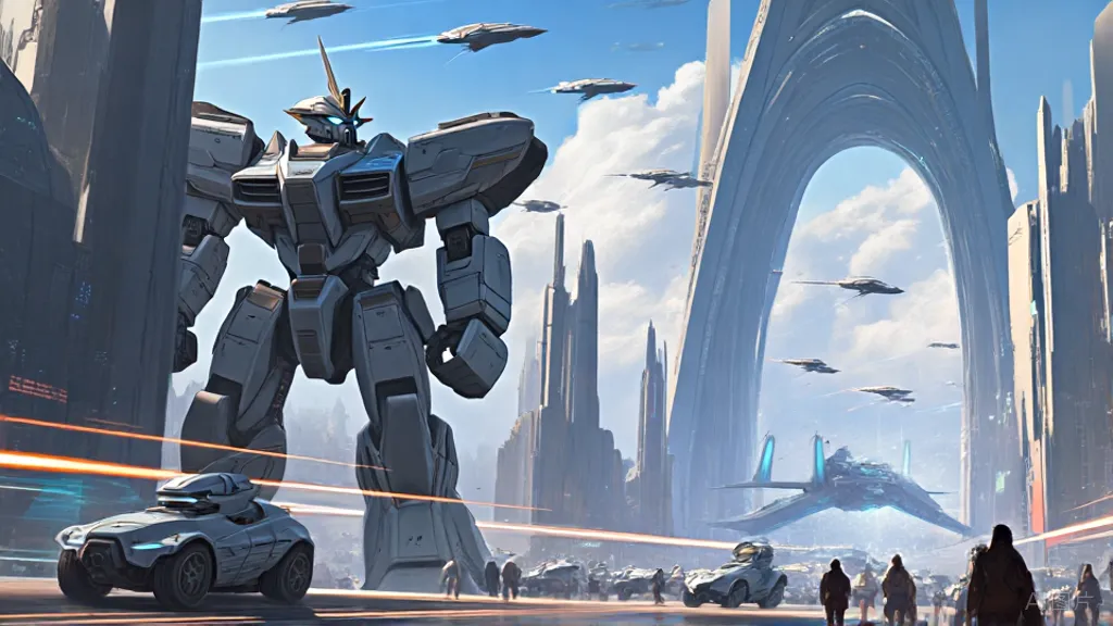 画面中有巨大的机械机甲,造型科幻,装备有武器,立于极具未来感的环形建筑之中,周围还有飞行器穿梭。