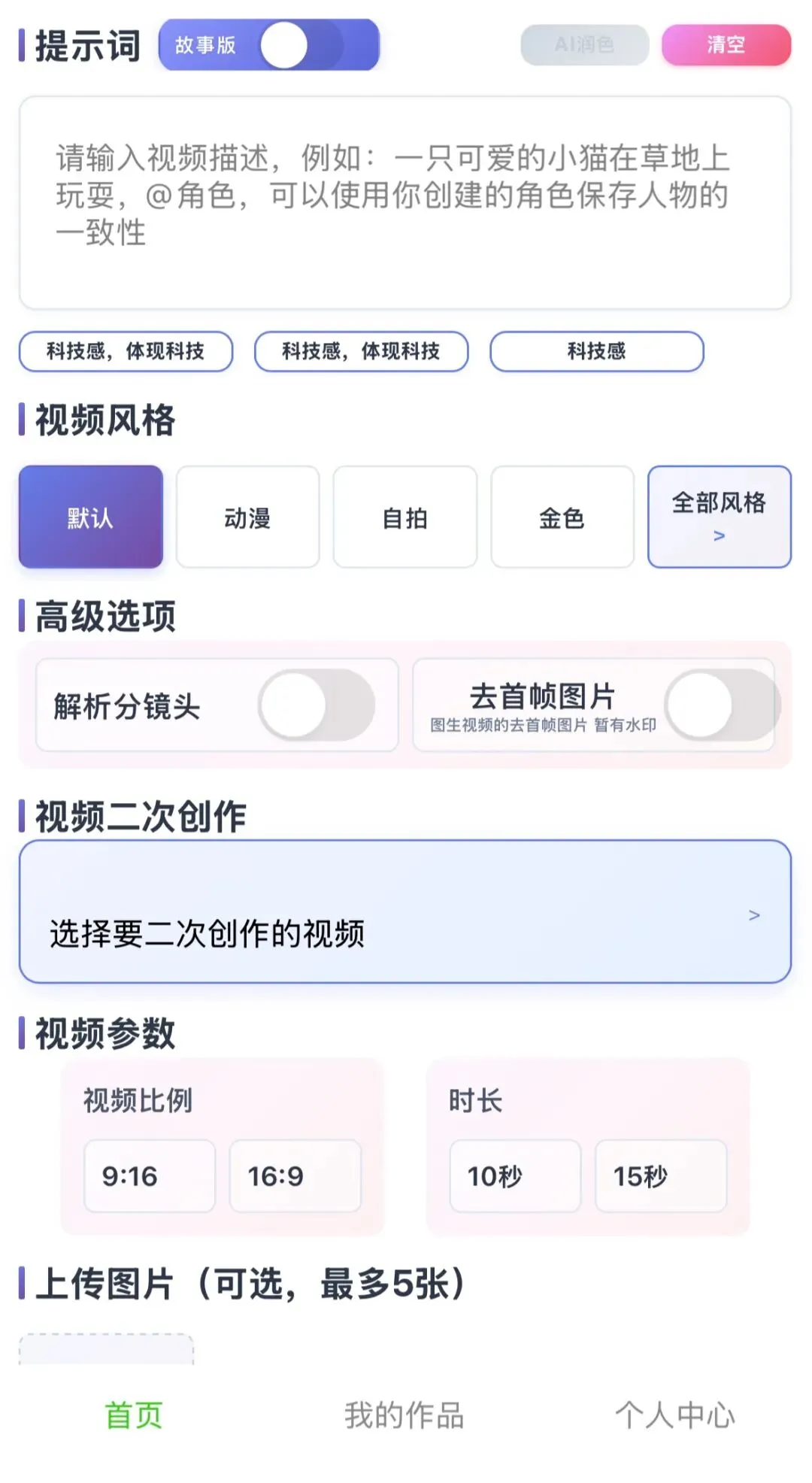 填写好提示词,视频风格根据自己需求不知道的可以选择默认,高级选择不需要的可以不选,视频参数可以根据自己的需求选择选择完后可以根据自己的需求是否上传图片