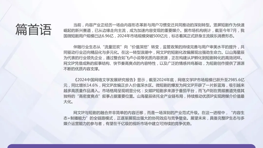 2025年中国网文IP短剧行业步入精品化与多元化发展新阶段,网文IP凭借独特优势成为短剧内容核心支撑。截至2024年,微短剧用户规模达6.96亿、市场规模突破500亿元,网文IP相关市场规模已达2985.6亿元且同比增长14.6%。平台格局呈现明显分化,番茄主导女频赛道、飞卢领跑男频赛道,男频已成为新增长蓝海,山海星辰、红果短剧等企业依靠全产业链布局与精品化运营占据主导地位。当前行业正朝着系列化、IP全域联动、漫剧渗透等方向演进,兼具确定性投资价值与创新增长潜力,成为文娱领域的热门赛道。