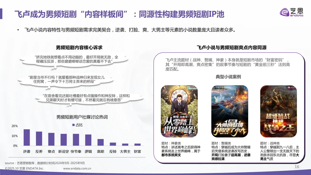 平台格局呈现清晰的垂直分工特征,女频短剧以番茄为核心供给来源,占头部短剧70%的份额,聚焦甜宠、重生、家庭伦理等情感共鸣类题材,目前已进入红海竞争阶段。男频短剧则由飞卢小说领跑,主打战神、赘婿等高密度爽点题材,占头部短剧30%份额;传统影视改编领域,阅文、晋江占据主导,占比超80%。男频能成为新增长蓝海,关键是需求尚未饱和,男性用户消费潜力没被充分挖掘,同时女性对男频短剧的需求也在持续增长。再加上供给端相对稀缺,飞卢系快节奏、大脑洞的内容形成了独特壁垒,同质化程度低。而且男频用户对力量型爽感的付费意愿高,客单价潜力大,2025年《我真没想重生啊!》《万里江山入我怀》等作品已经验证了成功模式,社媒讨论声量涨幅达到127.2%。