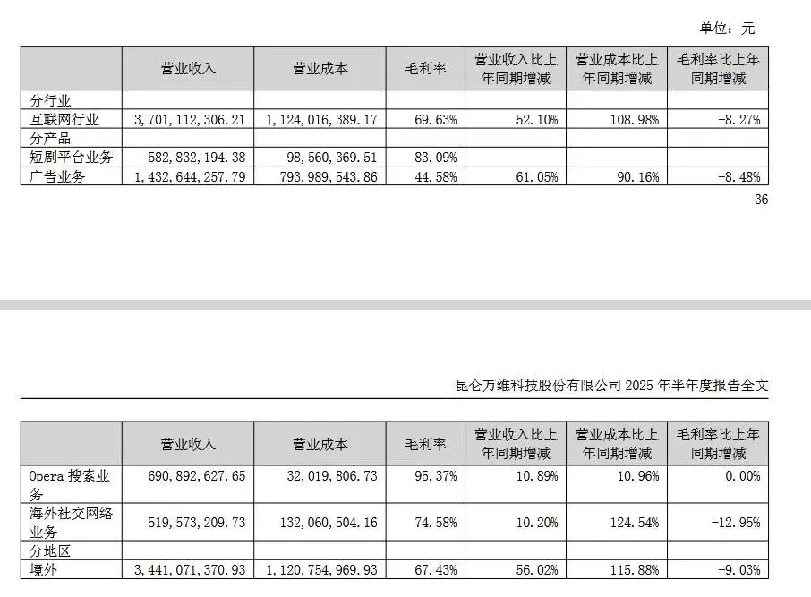 主业大模型与多模态技术的研发与应用落地的昆仑万维2025年上半年实现营收37.3亿元,同比增长49%,展现出三家公司中最强的增长动能。