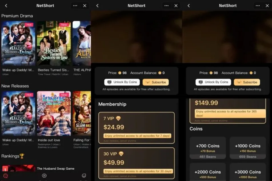 在运行逻辑上,这个短剧板块也与国内抖音模式极为相似,用户只需打开感兴趣的短剧平台,无需跳转应用便能看到各种题材短剧。一般前8-10集是免费,后续再看就要花钱,用户可选择花10美元左右解锁整部剧,或者每月花40-80美元开通会员,解锁全部内容。