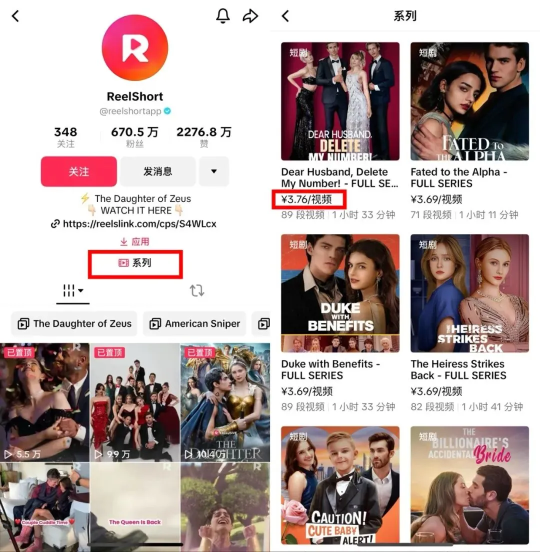 除了短剧小程序,TikTok也同时推行付费视频功能,这项功能名为“series”,用户可在主页添加该功能,把需要付费观看的视频放进“series”。目前,一些短剧独立平台如Reelshort已经开通“series”功能,从TikTok庞大的流量池中提取付费用户。