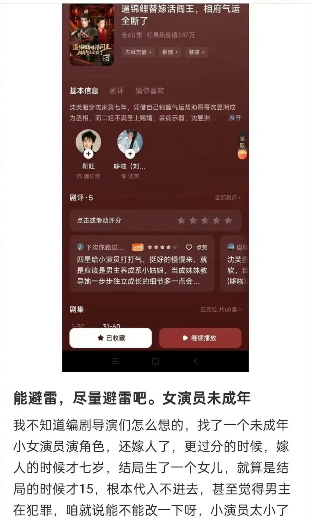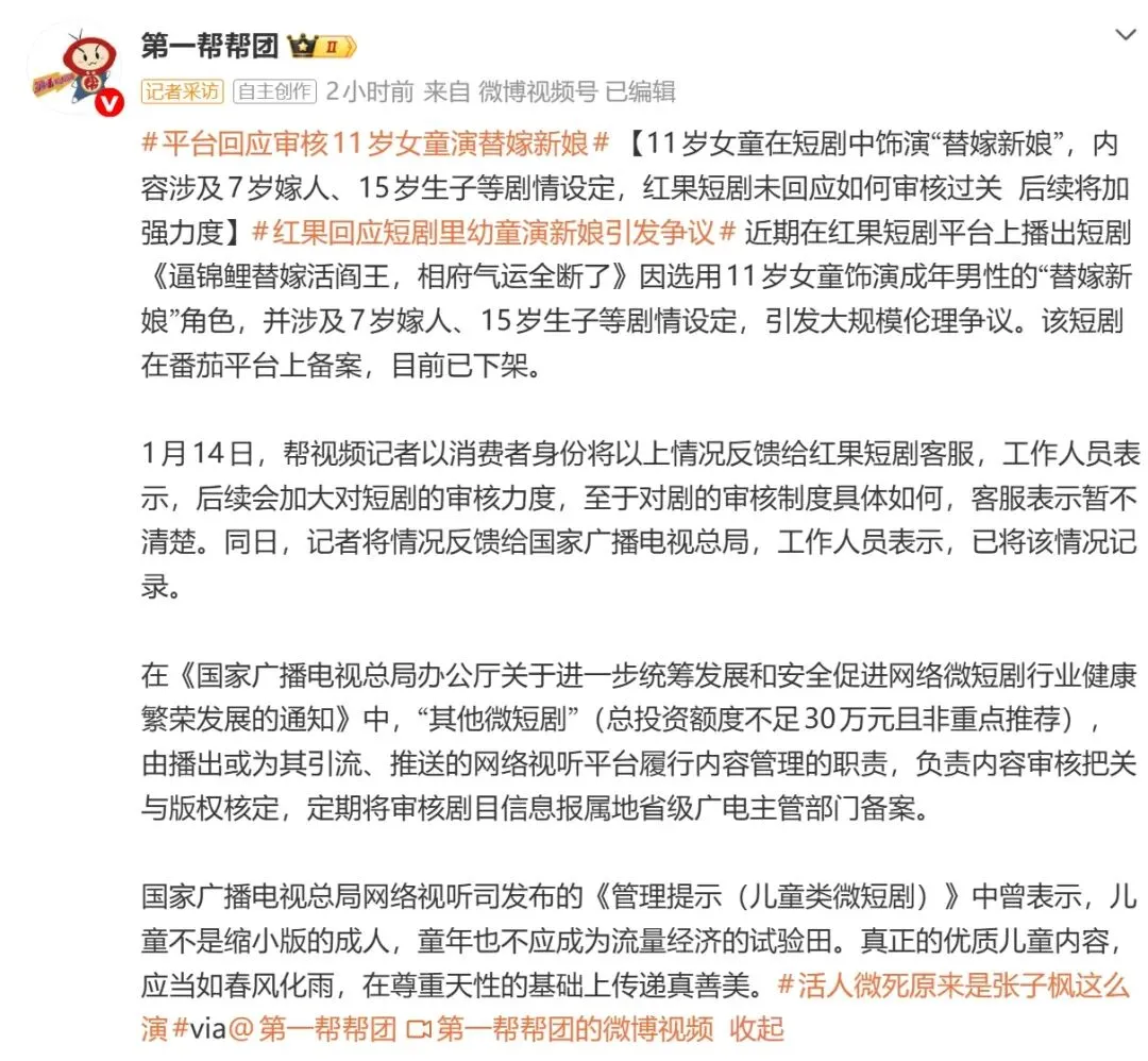 1月14日,短剧《逼锦鲤替嫁活阎王,相府气运全断了》因选用10岁女童饰演“替嫁新娘”引发争议。