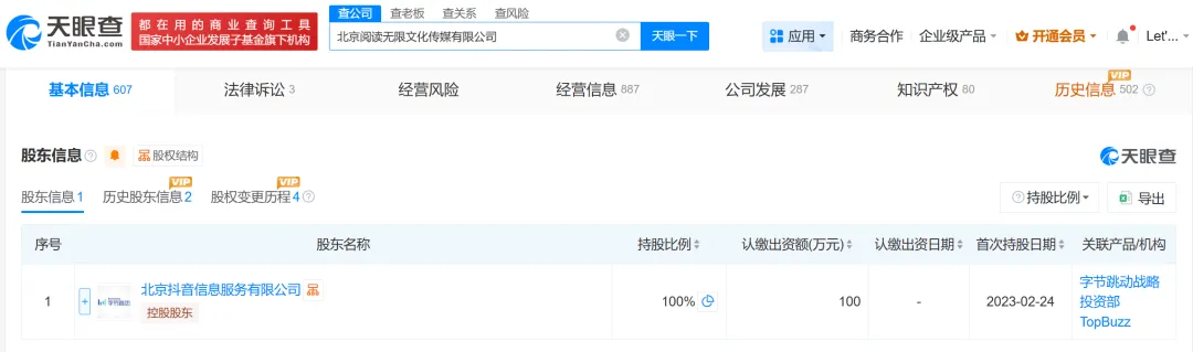 天眼妹查到,“番茄小说”品牌关联公司【北京阅读无限文化传媒有限公司】目前由【北京抖音信息服务有限公司】全资持股。