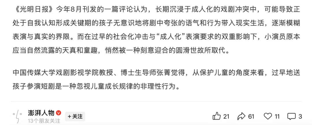 中国传媒大学戏剧影视学院教授、博士生导师张菁觉得,从保护儿童的角度来看,过早地送孩子参演短剧是一种忽视儿童成长规律的非理性行为。