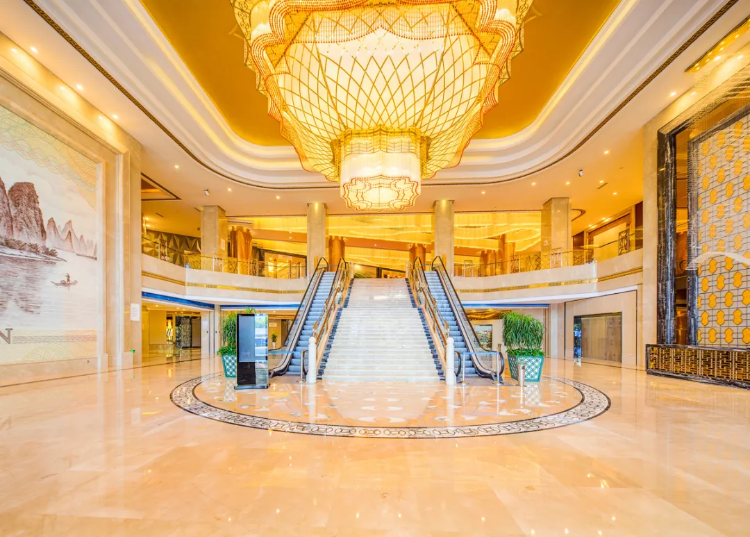丰景嘉丽大酒店与贵宾楼酒店,以精致奢华的装潢为核心优势——旋转楼梯蜿蜒而上的线条、水晶吊灯洒落的璀璨光影,在竖屏镜头下能最大化呈现优雅格调。无论是都市爱情剧里的豪门宴会,还是商战剧里的高端谈判戏份,都能精准契合场景需求。
