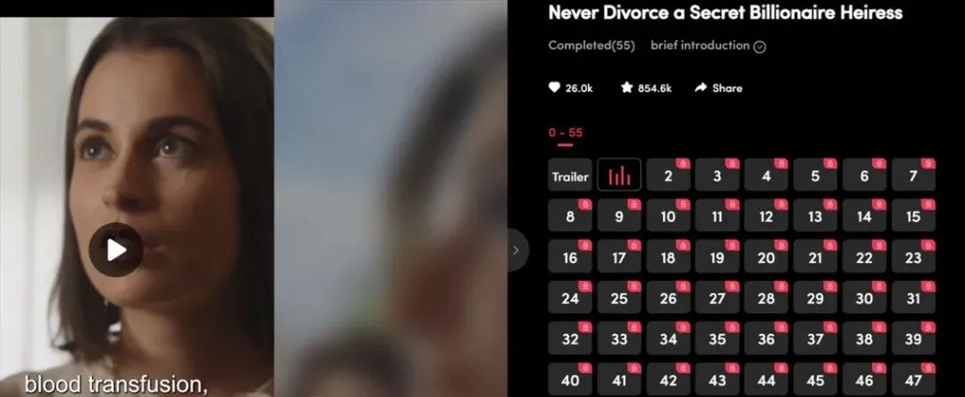 Billionaire Heiress》。Reelshort的活跃地区为美国、菲律宾和印度,下载安装量大约在500万-1000万,仅10月的下载量为200万。ReelShort APP上目前已经有几十部超短真人剧,每部剧分成40-60集1-2分钟的超短视频,可以免费观看部分内容,也可以通过观看30秒广告换取金豆来解锁后面的部分剧集。