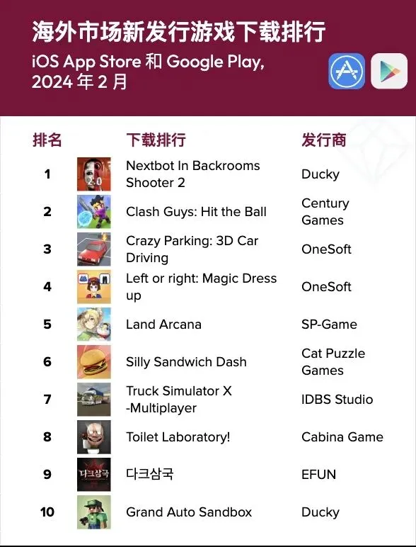 俄罗斯休闲游戏发行商Ducky于2月推出其PvE射击游戏续作Nextbot In Backrooms Shooter 2 ,并在俄罗斯、墨西哥、印度、巴西等新兴市场走红。游戏以近290万全球下载量登顶新游下载榜。榜单第2名为Clash Guys: Hit the Ball。游戏由点点互动发行,是一款轻量级的派对吃鸡游戏:玩家在竞技场中,通过击打移动的球体命中对手造成淘汰赢得最终胜利,截至目前已收获超240万用户下载。
