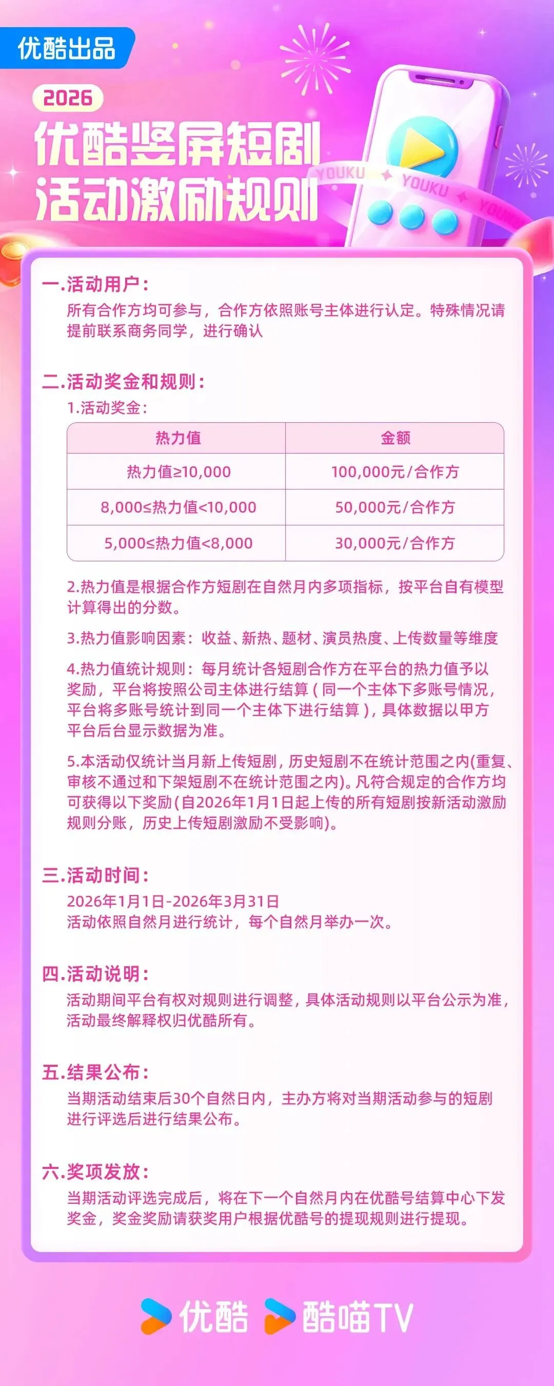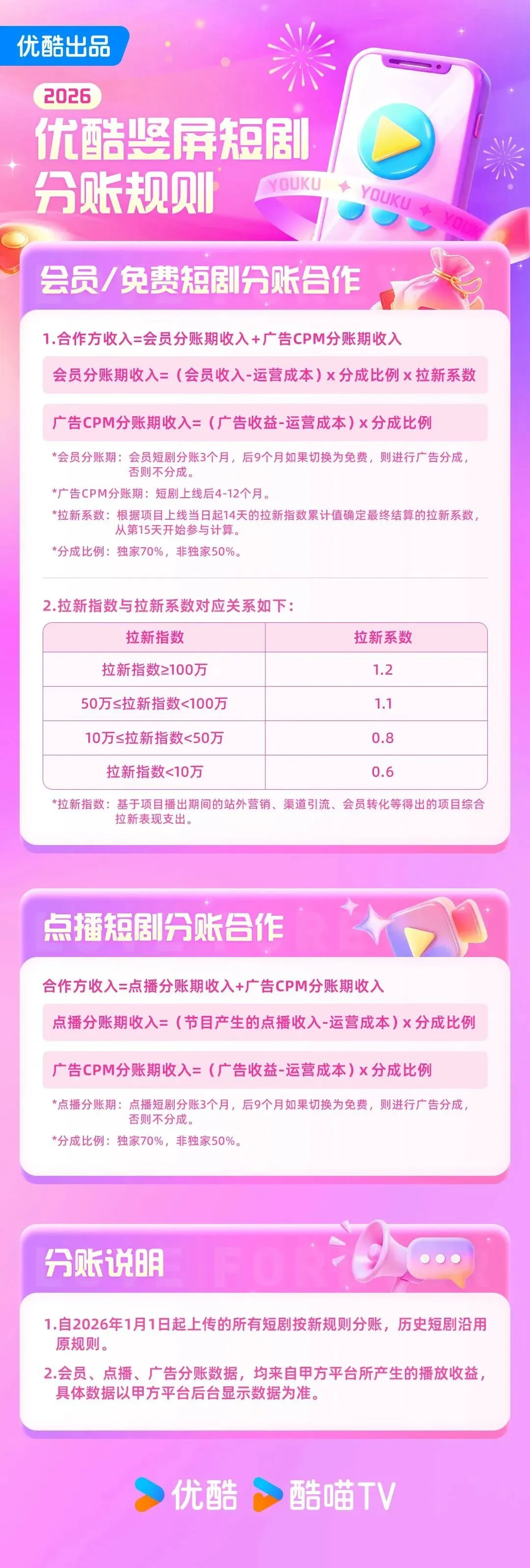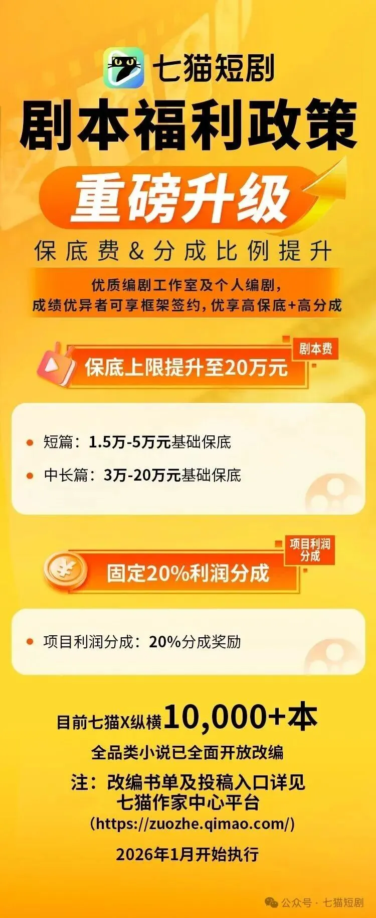 1月12日,百度旗下“七猫漫剧”APP上线,安卓和IOS渠道均可下载,打出了“免费看剧100年”的slogan。目前应用内功能设置还较为简单,暂无排行榜单,推荐的大多数作品为沙雕漫。1月12日,七猫短剧发布2026年最新剧本福利政策,剧本保底上限提升至20万元,项目利润分成固定有20%的分成奖励。优质编剧工作室及个人编剧,成绩优异者可享框架签约,优享高保底+高分成。1月12日,“星河计划”残疾人微短剧征集活动启动。活动面向全国范围内持有有效残疾人证明的个人或团队(团队核心编剧须为残疾人,且占比不低于50%),征集市场化题材和残疾人/助残题材的竖屏微短剧剧本。入选的优质剧本将由华礼星河签订相关合作协议并全额垫资制作,上线抖音、快手、腾讯视频等主流平台,创作者可获得收益分成,核心编剧将纳入“星河计划签约编剧库”,优先获得下一届项目创作权、长篇IP开发机会。1月13日,中文在线发布2025年度业绩预告。数据显示,公司归属于上市公司股东的净亏损约为5.8亿元至7亿元,扣除非经常性损益后的净亏损为5.793亿元至6.993亿元。此次亏损主要由于公司为扩大海外业务规模,对海外短剧业务加大推广投入,而相关业务2025年度尚处于投入期,利润呈亏损状态,最终导致归属于上市公司股东的净利润较上年同期大幅下降。1月15日,广电总局发布第三季度优秀网络视听作品推选结果,共100部作品入选,其中,网络微短剧占21部。入选的网络微短剧包括:《去桃花盛开的地方》《墨韵新生》《反诈·猎蜂者》《大力村超人》《鹦鹉》《破晓时出发》《踏雪寻熊》《搏忆》《小美满》《大妈的世界3:大妈闯职场》《飞虎乘风》《镇宁的李子》《朱雀堂》《万民清碑》《反诈破局》《来自远方的星星》《今月曾经照古人》《铁血英魂》《我在基层当“诸葛”》《来了就是深圳人之立正,永不稍息》《晴空之下》。1月15日,字节跳动旗下巨量引擎在微信推出两款短剧小程序,分别是“剧燃空间”与“乐萌剧场”,均为“看广告解锁剧集”的IAA(广告变现)模式。目前小程序内短剧数量不多,均设置了广告位。1月15号,在2026微信公开课短剧专场上,腾讯官方表示,微信针对短剧生态上构建了全方位的一体化解决方案,通过打通内容、发行、消费到变现的全链路,致力于打造一个健康可持续的生态。2025年,微信生态短剧主体增长超31%,收入破千万的公司超90家。其中真人短剧数量近30万,漫剧上架增长3380%。1月16日,红果短剧导演、编剧认证通道正式开启,这是继演员、作品管理之后,红果平台发布的又一认证通道。此次认证仅针对总导演和总编剧,执行导演、副导演、选角导演、动作/美术导演以及联合编剧、编剧机构、剧本策划等暂缓开放。1月16日,2026年优酷竖屏短剧分账规则全面升级。新分账规则中,合作方收入由“会员分账期收入+广告 CPM 分账期收入”或“点播分账期收入+广告 CPM 分账期收入”构成。独家合作可享受70%的分成,非独家合作为50%。会员/免费短剧设置了“拉新系数”激励,可获得最高1.2倍的结算系数。分账周期方面,会员与点播短剧均为3个月分账期,后9个月如果切换为免费,则进行广告分成,否则不分成。▼上下滑动查看完整图片另外,优酷短剧同步推出活动激励玩法,热力值达到激励标准的合作方可获得最高10万元奖金。1月16日,番茄发布“2026年度作家福利”,覆盖优质内容激励、短剧版权激励、拉新拓客激励,全新升级五大活动激励。其中,“短剧专项计划”优质版权激励,现象级爆款短剧的原著奖励最高可达300万元/部。1月18日,2026年杭州“AI+微短剧”产业发展大会在临平举行。大会现场,杭州文化“新三样”出海视听产业服务中心正式启用,创新构建“技术支撑+跨境服务+版权保障”三位一体服务体系;与此同时,杭州丰收湖文化科技融合产业集聚区揭牌亮相,为“文化+科技”融合发展再添新载体。大会现场还同步启动全国AI短剧剪辑大赛,设立杭州、上海、芜湖和武汉四大赛区。