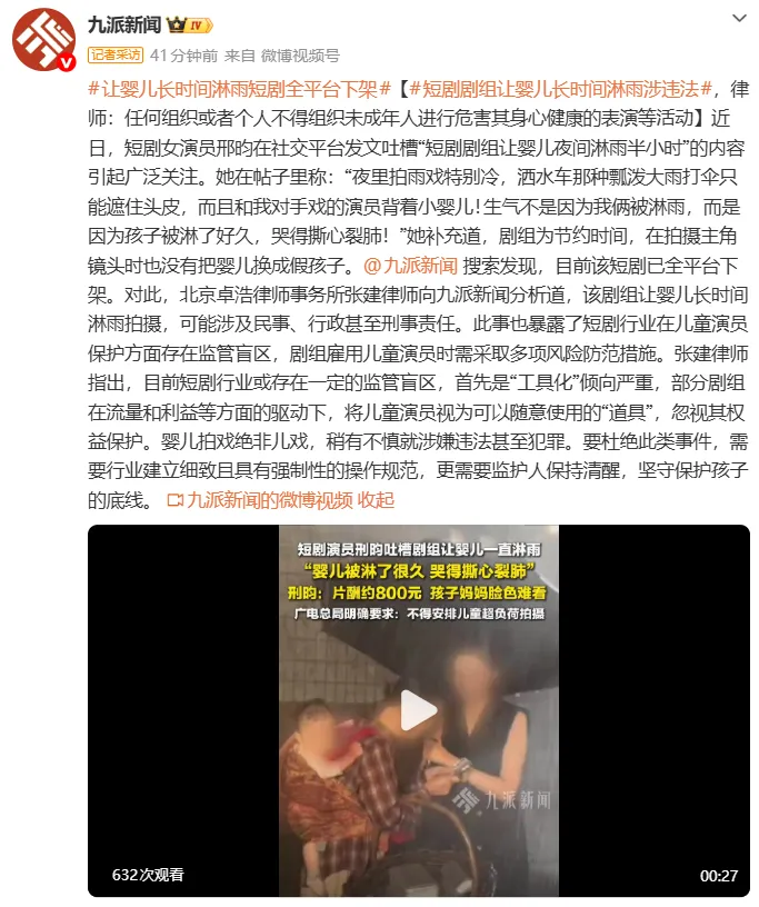 对此,北京卓浩律师事务所张建律师向记者分析道,该剧组让婴儿长时间淋雨拍摄,可能涉及民事、行政甚至刑事责任。此事也暴露了短剧行业在儿童演员保护方面存在监管盲区,剧组雇用儿童演员时需采取多项风险防范措施。