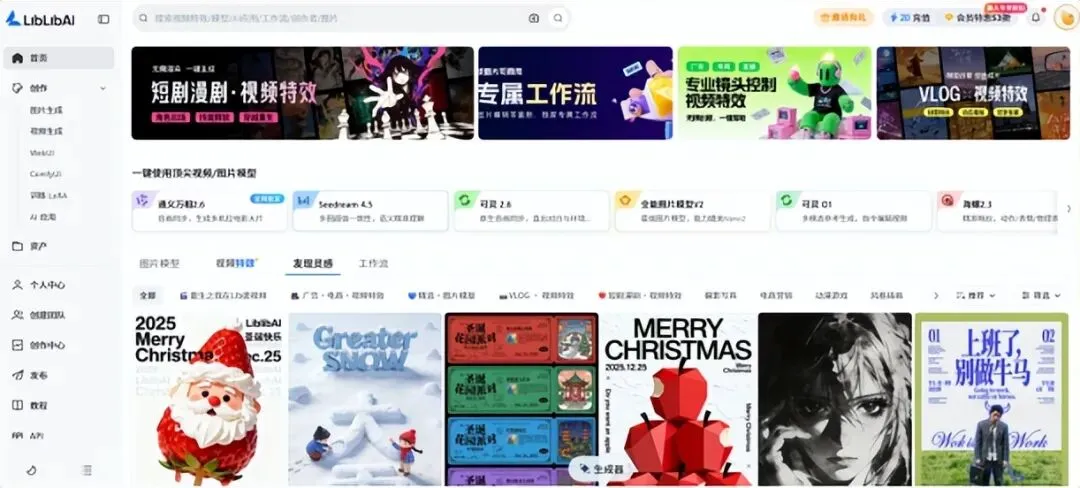 有了脚本,就进入了最具挑战也最有成就感的环节——视觉呈现。其核心痛点是角色与场景的风格统一。这里以 LibLib AI为例 ,它集成了文生图、图生视频、数字人等顶级模型,让你在一个平台内解决所有视觉问题,避免在多工具间切换导致风格断裂。