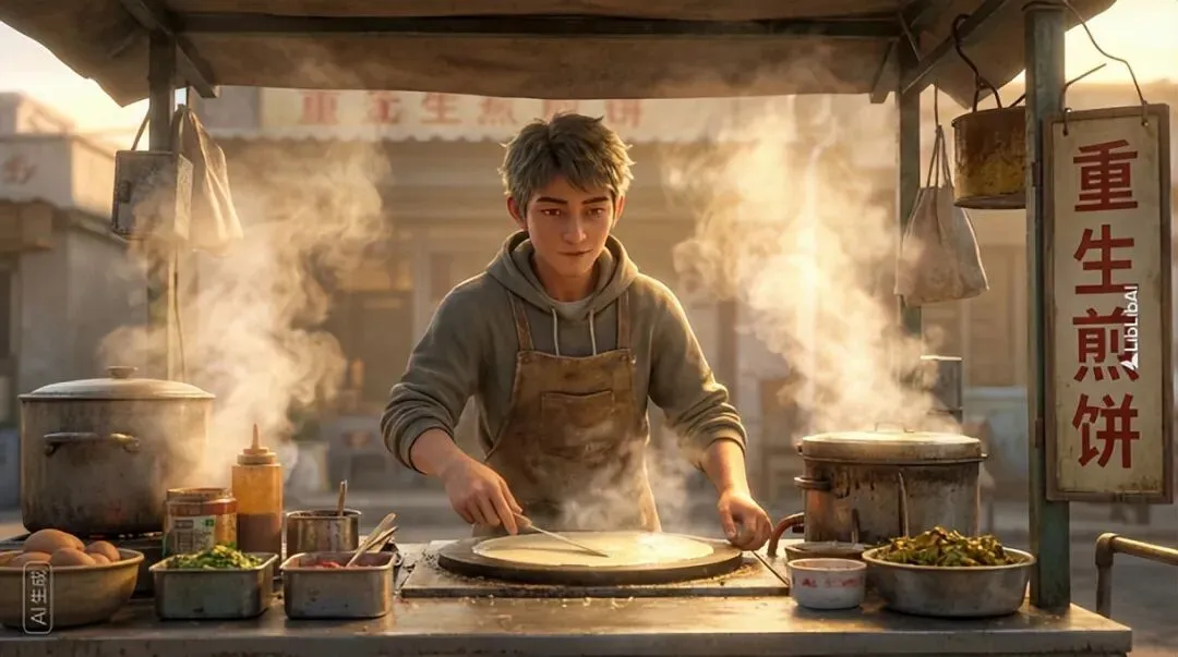 AI可能会给你诸如《重生之我是国宴主厨》、《高考前,我靠早餐摊养活全家》等灵感。我们选择其中一个深化,例如:《煎饼重生摊》。