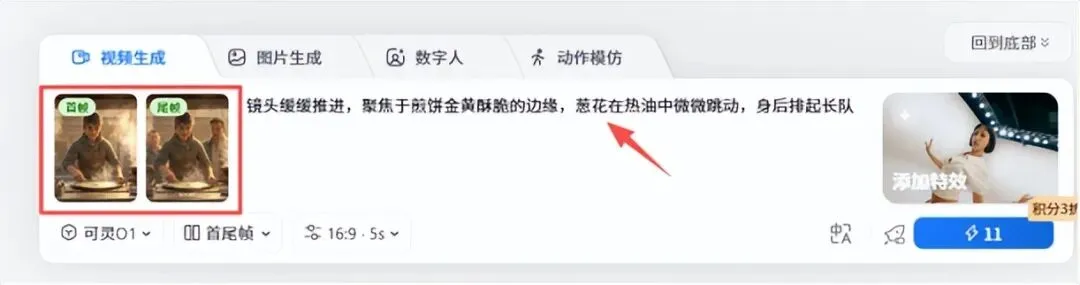 操作:上传静态图,在提示框输入动态指令,如:“镜头缓缓推进,聚焦于煎饼金黄酥脆的边缘,葱花在热油中微微跳动,身后排起长队。”