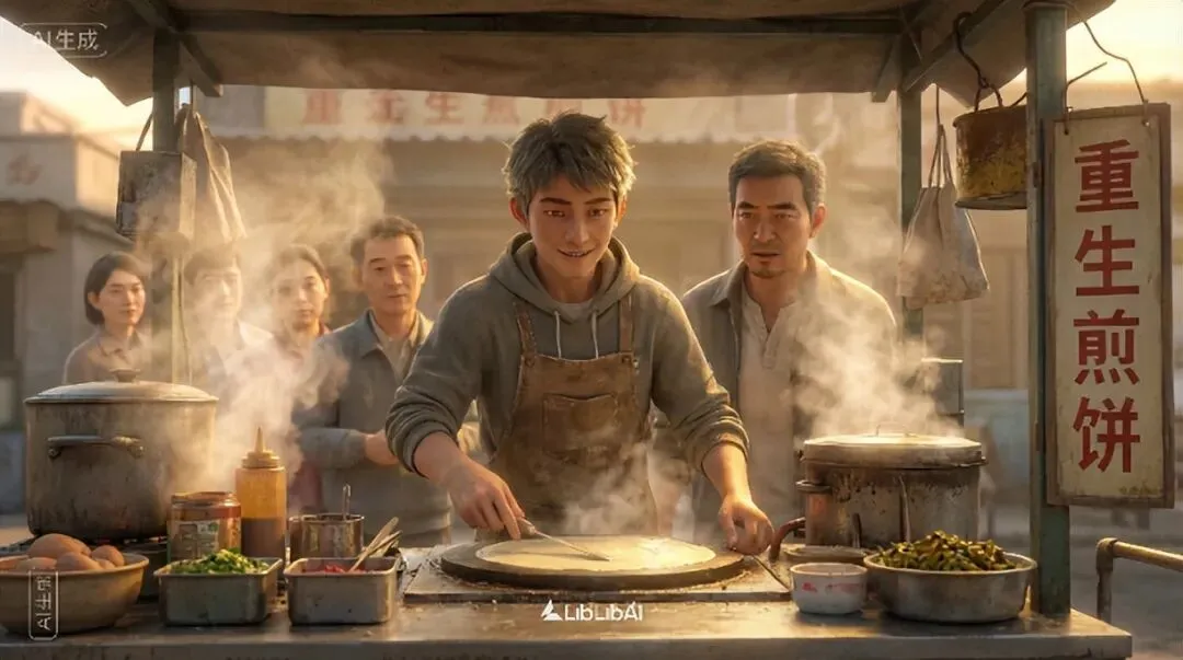 画面描述(文生图提示词):例如:‘清晨五点,冷色调的昏暗小巷, “老张煎饼”招牌灯箱忽明忽灭。20岁出头、眼神疲惫却坚定的男主(李想),穿着旧围裙,正将一勺面糊精准浇在鏊子上,热气蒸腾。’