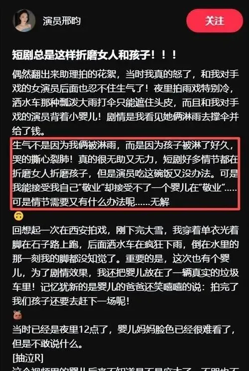 目前,行业中缺少专门针对儿童出演者的管理细则。剧组往往在流量驱动下盲目赶工,忽略人身安全评估与心理疏导环节。把一个刚出生的婴儿放进雨水中——这不是在拍戏,是在挑战法律底线与人类良知。