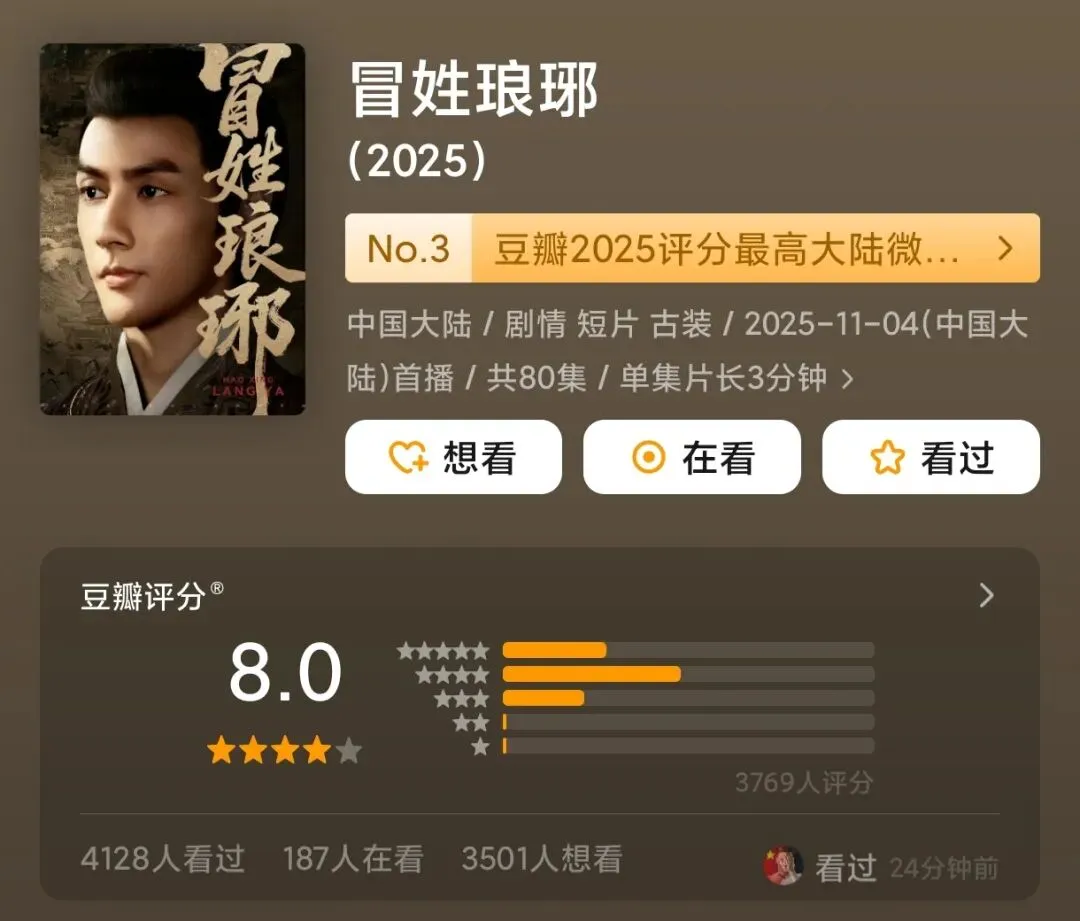 一部单集3分钟、共80集的短剧,居然在豆瓣拿到了8.0分,还冲进“2025评分最高大陆微短剧”Top3?