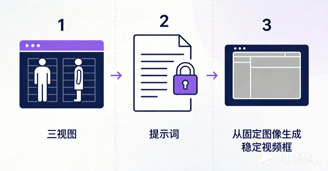 * **固定角色设定**:为每个主要角色生成标准“三视图”,并像法律条文一样,在所有提示词中固化其外貌描述关键词。 * **细化分镜描述**:在提示词中精确到服装纹理、发型细节、饰品、以及场景的**光影色调与时间**。 * **坚守“图生视频”流程**:务必先产出满意的角色“定妆照”和场景关键帧,再以此为基础生成视频,这是保证角色不“变脸”的最有效手段。